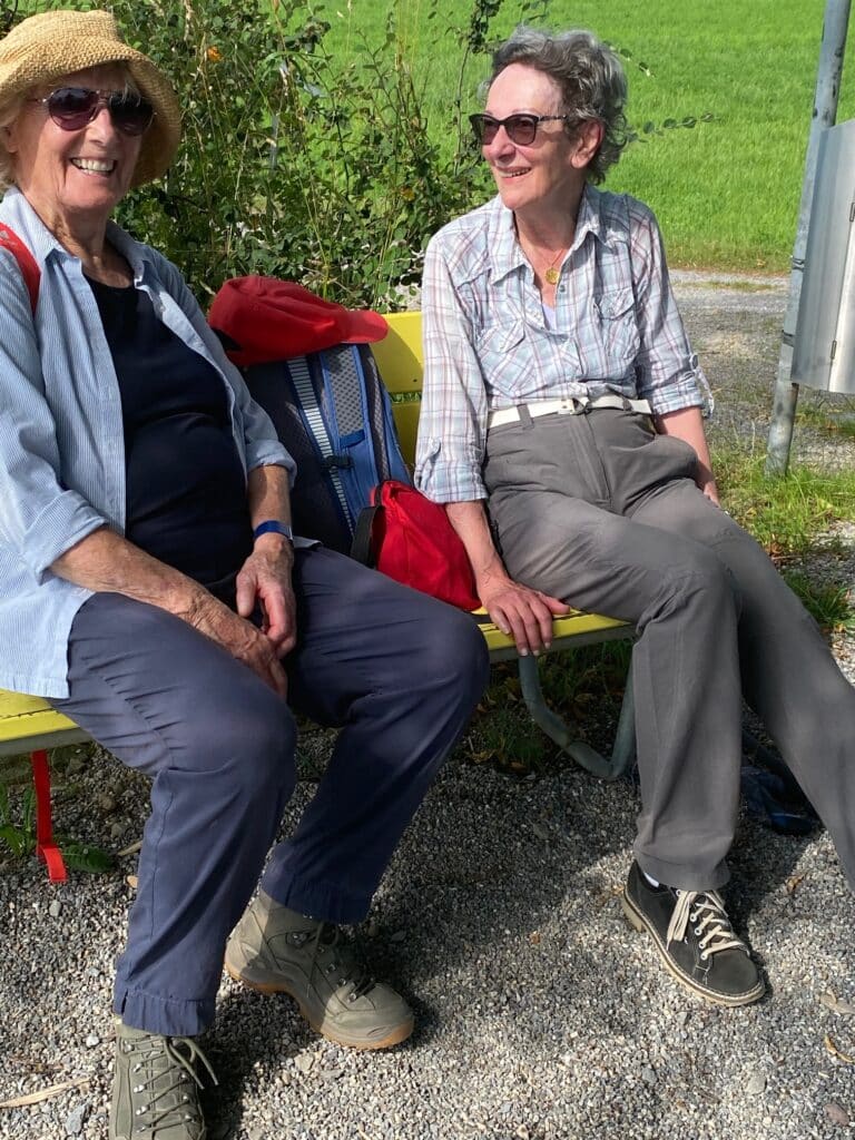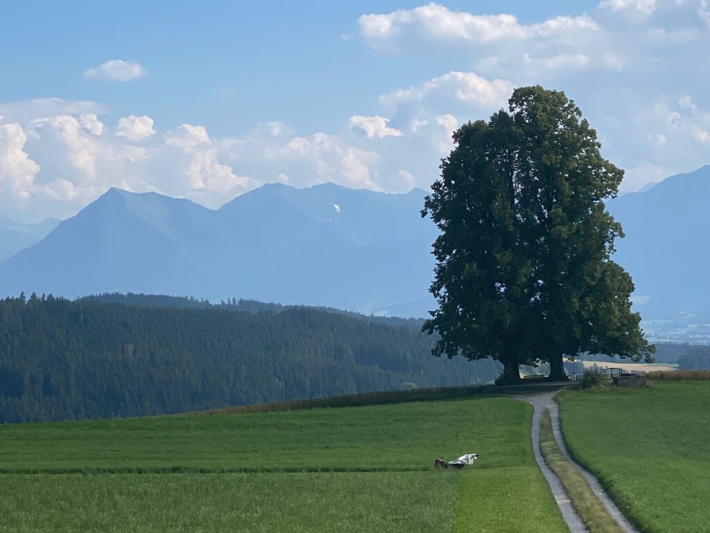 Unter zwei mächtigen alten Linden gibt’s eine wohlverdiente Pause. Die Aussicht ist atemberaubend! Dies ist ein echter «Schauinslandplatz»; bei klarer Sicht wären hier zwischen Schrattenfluh und Chasseral 150 Gipfel zu sehen. Heute verstecken sich die Schneeberge allerdings hinter den Wolken. Doch der markante Niesen und die geschwungene Stockhornkette lassen sich im beginnenden Abendlicht wunderbar betrachten.