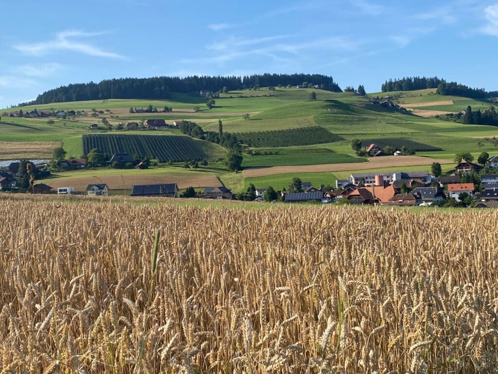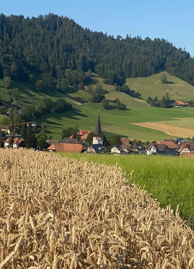 Gestärkt und guter Dinge setzen wir unseren Weg fort, vorbei an wogenden Getreidefeldern und mit Blick auf die sanften Hügel des Emmentals. Die harmonische und fröhliche Wandergesellschaft lässt den Weg kurzweilig erscheinen. Kurz vor dem letzten Abstieg sehen wir, überraschend und eingebettet in hügeliges Grün, die Kirchturmspitze von Zäziwil in der Abendsonne leuchten. Apropos Zäziwil: Hier findet jährlich im September die «Brächete» statt, ein traditionelles Fest aus Gotthelfs Zeiten, bei dem der Werdegang der Flachspflanze zum Leinenstoff gezeigt wird.