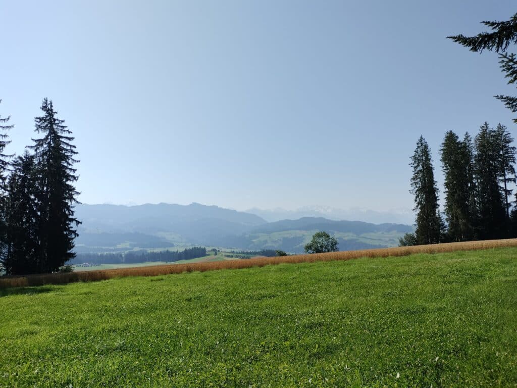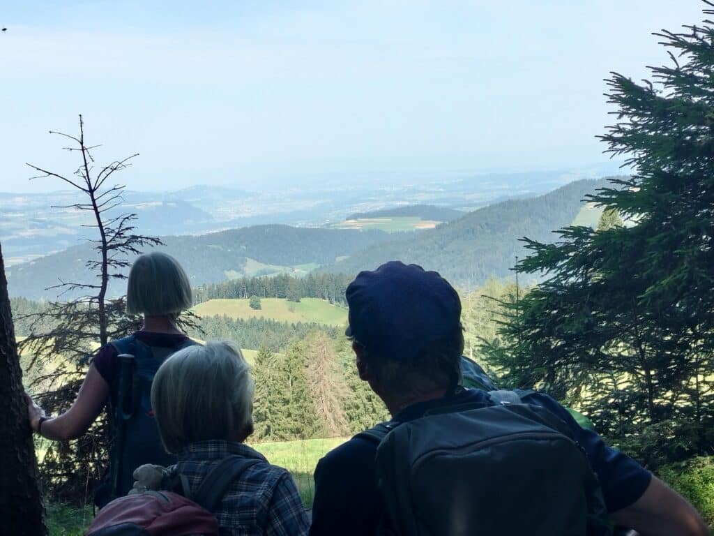 Wunderbar rhythmisiert der Wechsel von sonnigen Abschnitten, entlang von Weiden, an stolzen Bauernhöfen vorbei, durch kühlende Waldabschnitte beschützt, wieder hinaus auf die freiliegenden Wege auf der Höhe mit einer Aussicht ringsum auf das Tal, die Hügel und Berge.