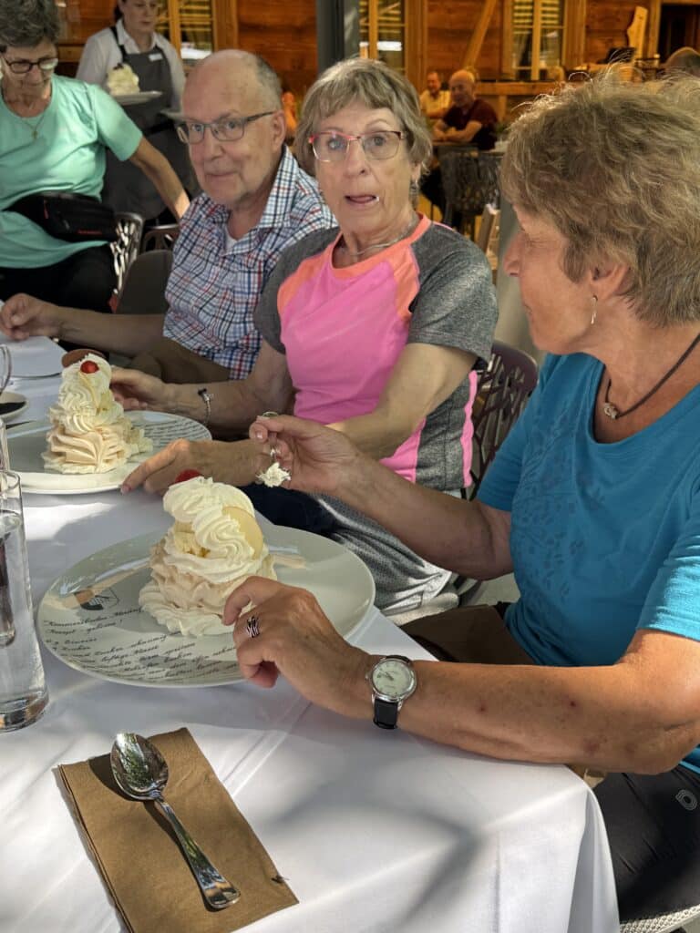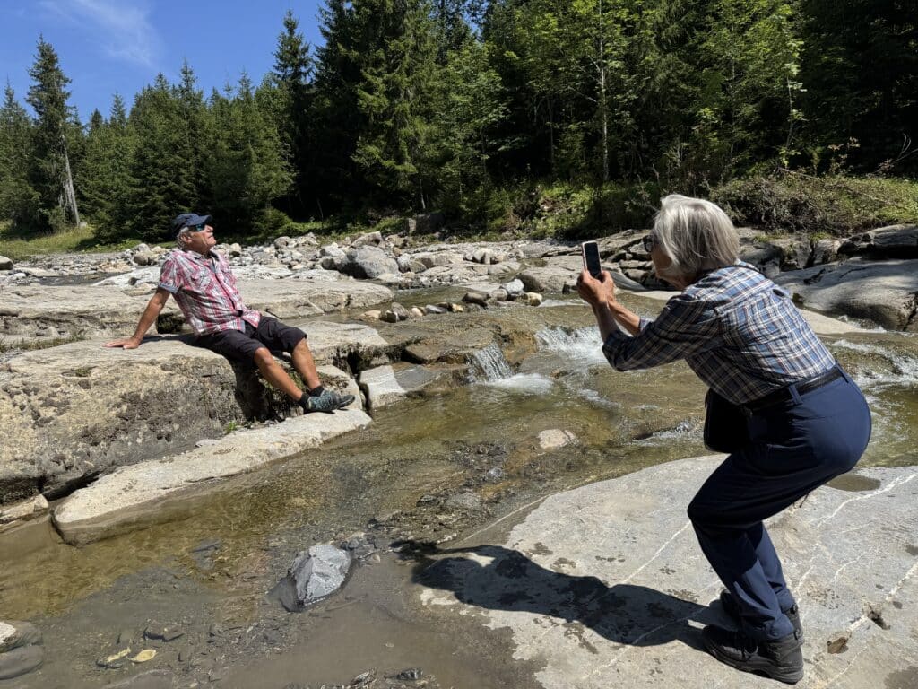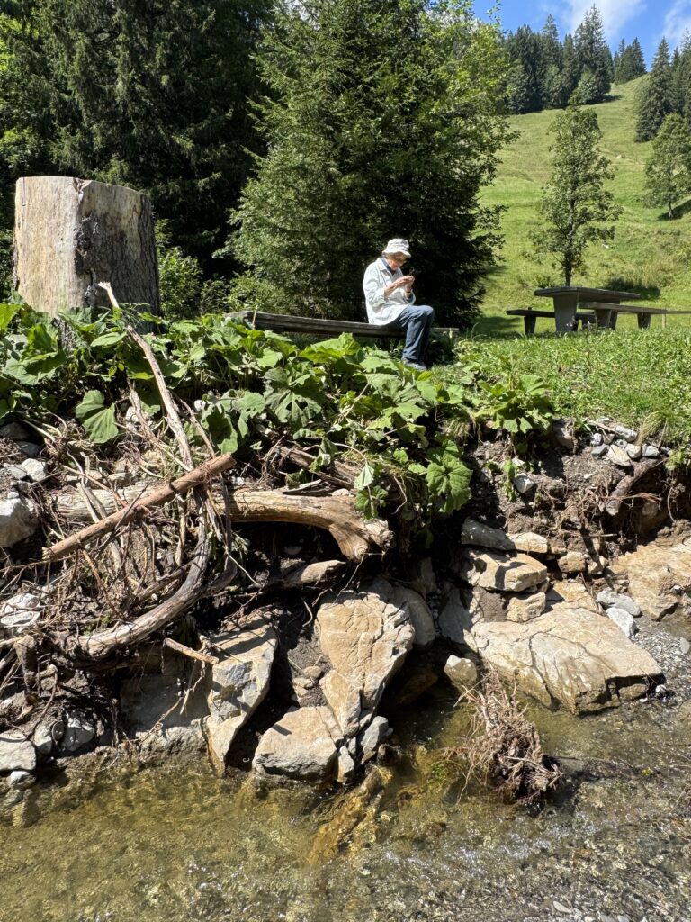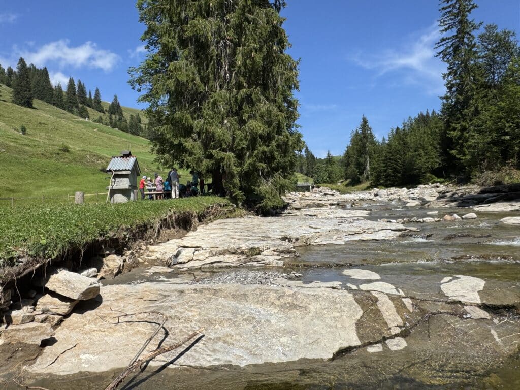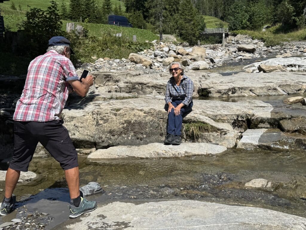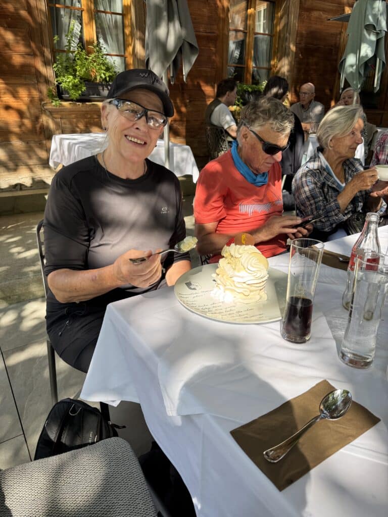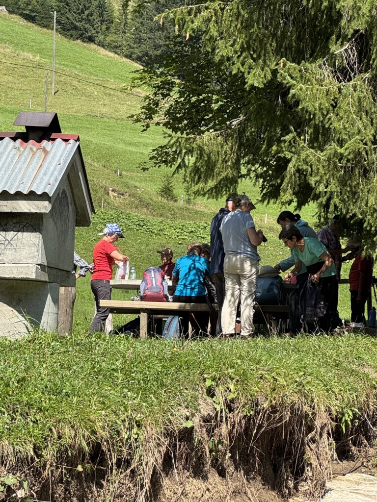 Für den Mittagsrast hat sich Wanderleiter Daniel ein ganz besonders idyllische Plätzchen am Bärselbach ausgesucht. Die Sonne schien, und es war fast zu verlockend, einfach sitzen zu bleiben und die Seele baumeln zu lassen. Aber das Ziel rief, das berühmte Kemmeribodenbad mit seiner legendären «Merängge». Im letzten Abschnitt ging’s zügig voran. Wanderleiter Daniel hatte offenbar an diesem Tag eine extra Portion Abenteuerlust intus. Auf einem engen Pfad steil runter zum Bergbach landeten wir an einem gesperrten Weg. Also «ganze Mannschaft kehrt» und wieder hoch. Wir haben geschmunzelt und einige Höhenmeter zusätzlich sind ja eine sportliche Leistung. Der richtige Weg war schnell gefunden und dann war es geschafft – das Kemmeribodenbad lag vor uns. Wir haben uns gemütlich zusammengesetzt, Merängge geschnaust und den Tag Revue passieren lassen. Rund 3 Stunden Wanderzeit, 100m rauf und 600m runter, da haben die Knie ordentlich gearbeitet. Also Leute, da könnt ihr euch wirklich mal auf die Schulter klopfen!