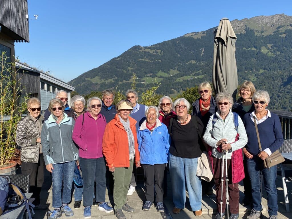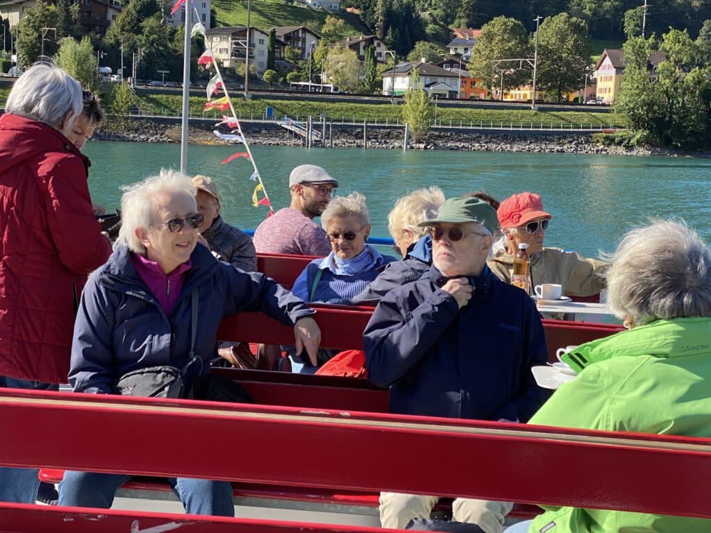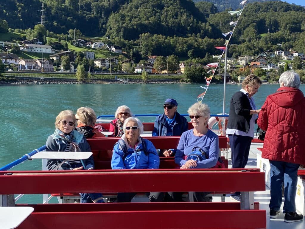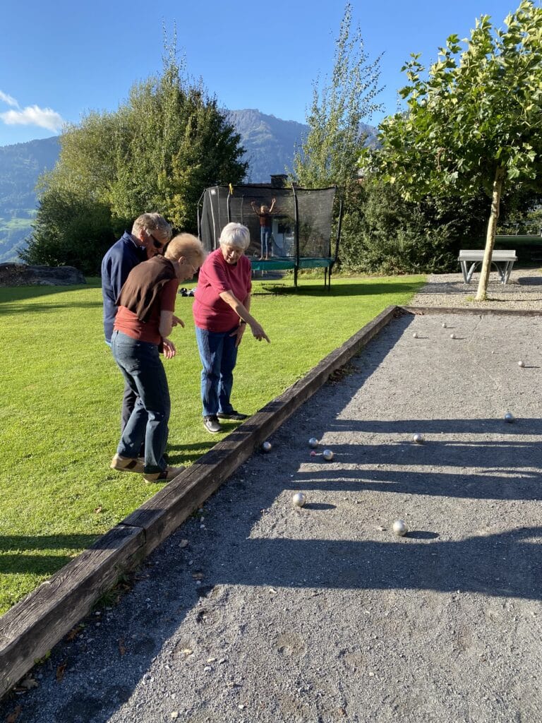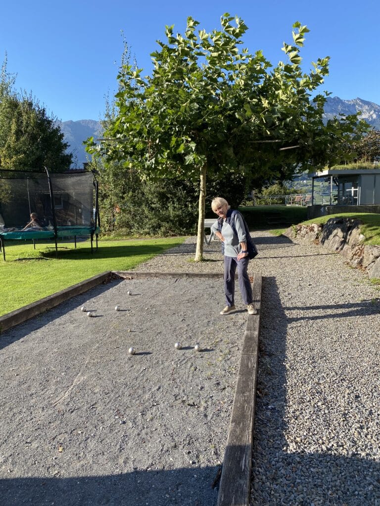 Mittwoch – und strahlendes Wetter! Poschi und Bahn brachten uns zum Schiff in Unterterzen. Die Sonne strahlte, der See blinzelte in allen Blau- und Grüntönen und die Sicht auf die Berge rundherum – einfach grossartig! In Au verliessen die Wanderer das Schiff und begaben sich zu Fuss nach Quinten. Über einen romantisch-verwachsenen Waldpfad verlief die kleine Wanderung, immer mit Blick auf den See und kleine Badebuchten, bis direkt ins Restaurant Seehus. Als kleine sportliche Einlage kam hinzu, dass ein ausgewachsener Baum sich über den Weg gelegt hatte und die Panther, je nach Grösse, über oder unter dem Baum durchkriechen mussten – was selbstverständlich zu viel Gelächter führte. Im Restaurant Seehus war für uns ein Tisch auf der Terrasse reserviert. Wir wurden mit gutem Essen und einem ausgezeichneten Service verwöhnt. Mit Schiff und Postauto ging es dann wieder in die Höhe – und zum Boulespiel. Karin Brönnimann hatte eine Bocciabahn vor dem Hotel entdeckt und sofort Kugeln und Spieler organisiert.