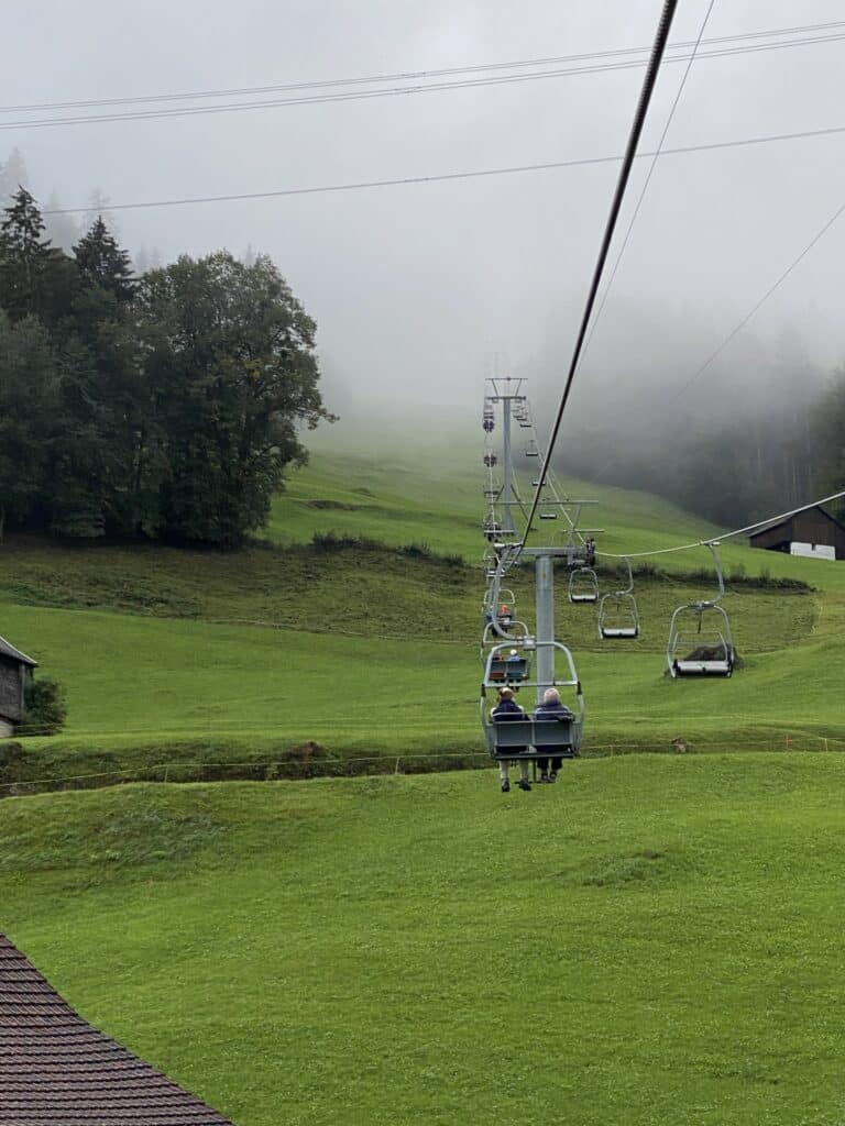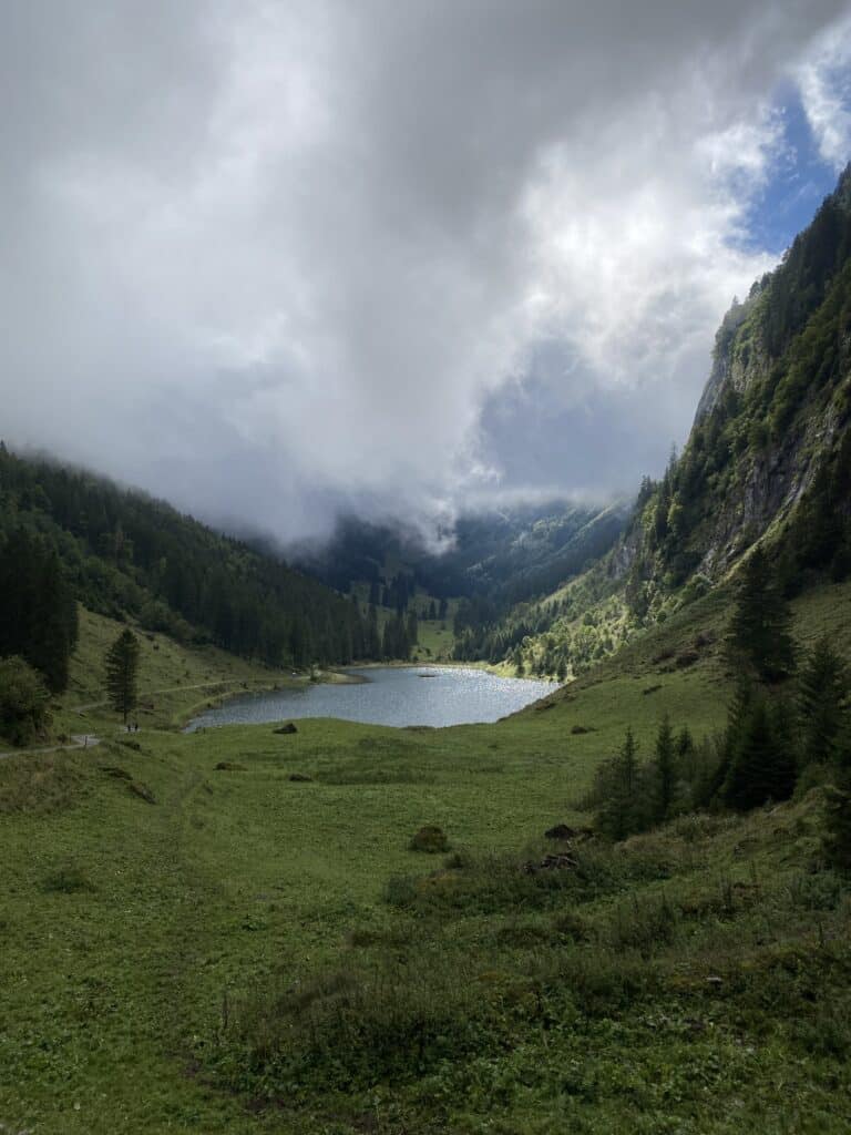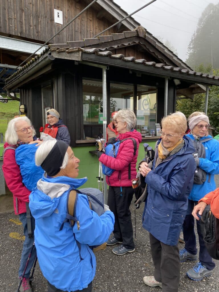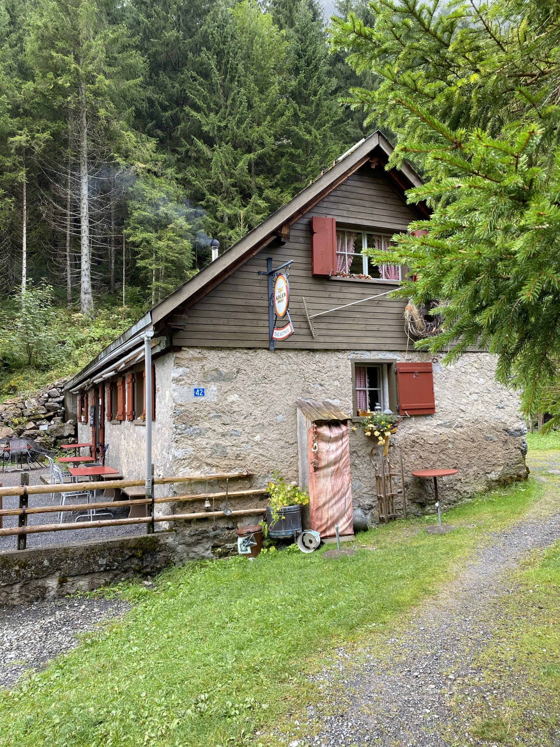 Bei grauem Wetter und ein paar letzten Regentropfen schwebten wir am nächsten Morgen mit der langsamsten Sesselbahn der Schweiz hinauf nach Habergschwänd. Ich fuhr (da meine Wanderfähigkeiten praktisch gleich Null sind) mit Carola und ihrem Auto zum Talalpsee hinauf. Welch eine «kleine Perle im Bergesrund» und daneben ein richtig nettes altes Gasthaus. Die Gruppe pfiff aufs Picknick. Nach einer kurzen Wanderung sassen alle um die Holztische und assen die einfachen, hübsch aufgetischten, Leckerbissen.