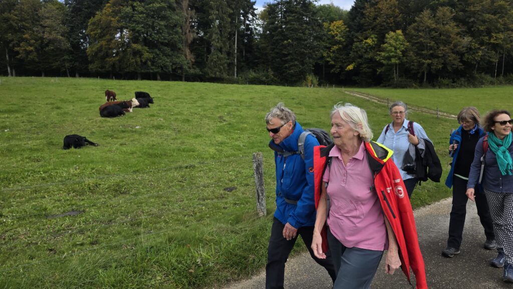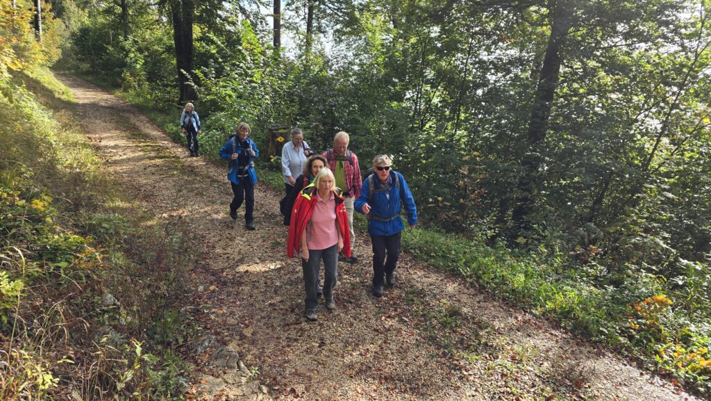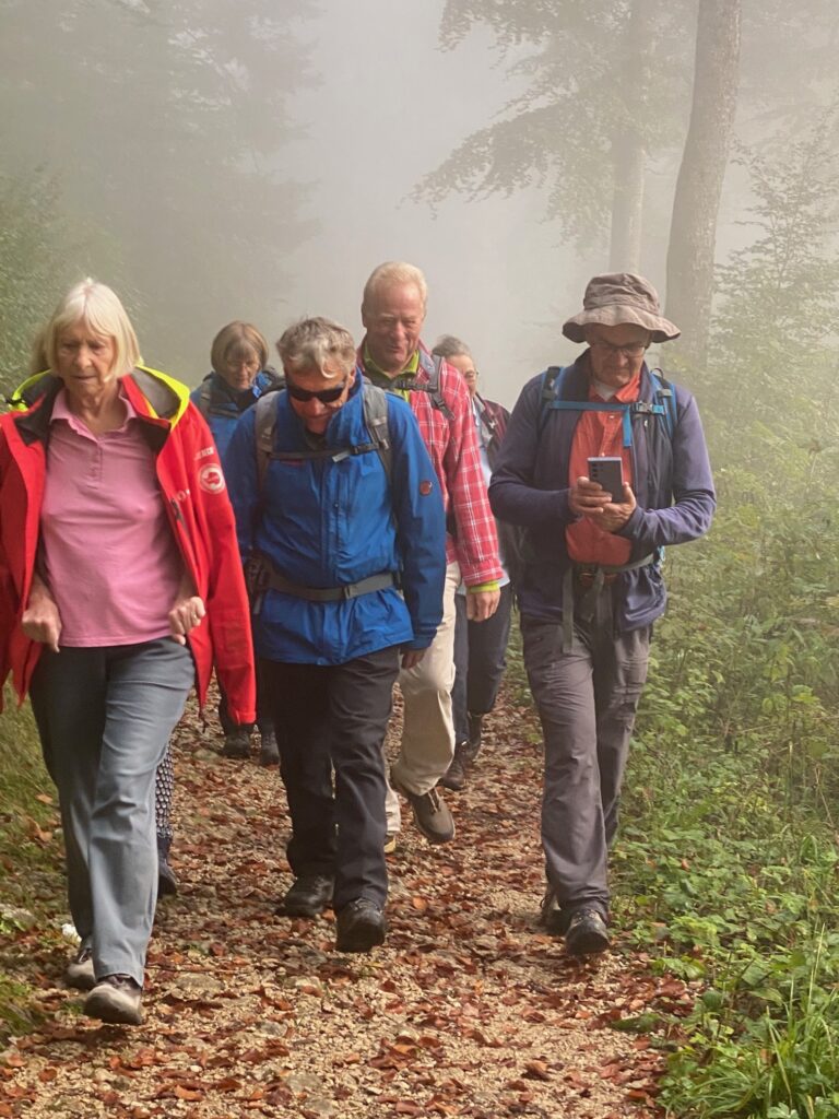 Sechs wanderfreudige Graue Panther haben sich Sylvia und Ruedi bei ihrer monatlichen Montagswanderung am 7. Oktober 2024 angeschlossen. Inmitten von Sekretären der Gewerkschaft Industrie, Gewerbe, Dienstleistungen SMUV steigt das Grüppchen aus dem Funiculaire in Magglingen. Sogar zur SMUV-Tagung waren sie von den tatkräftig wirkenden Sekretären eingeladen worden, verfolgen aber unbeirrt ihren Plan, um 14.00 Uhr in Twann anzukommen. Kurz durchbricht die Sonne den Nebel um ihre Anwesenheit zu signalisieren und das Hervornehmen der Sonnenbrille nicht als überflüssig abzutun.