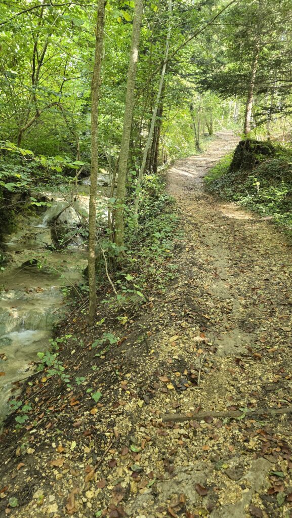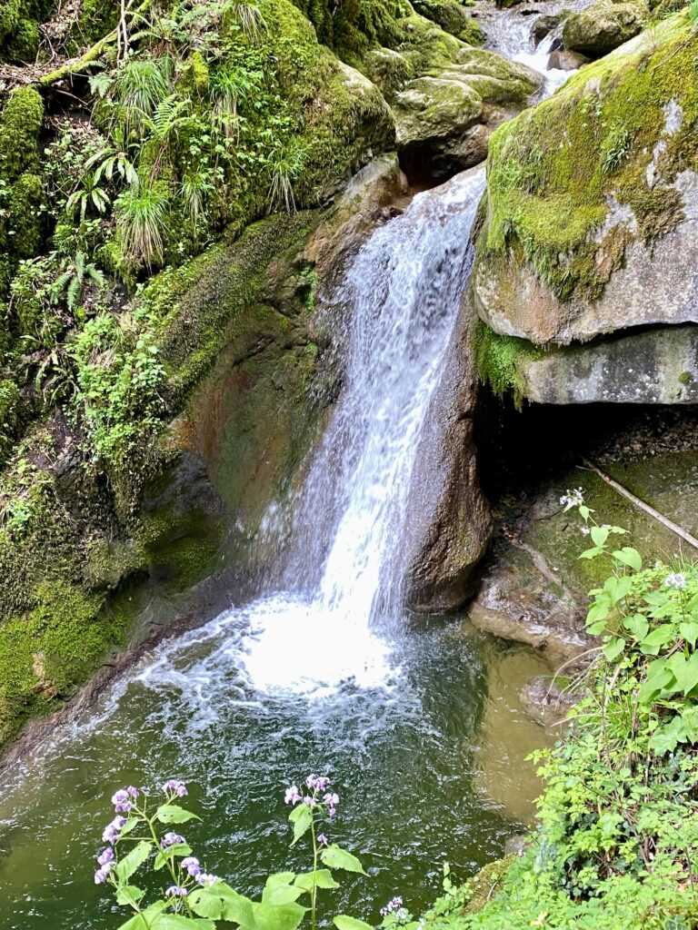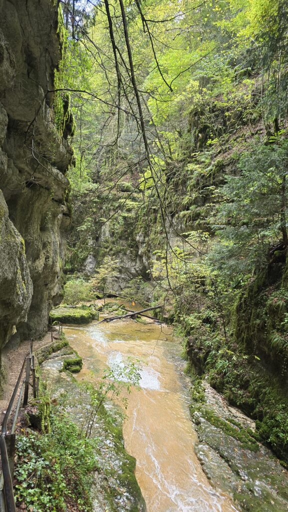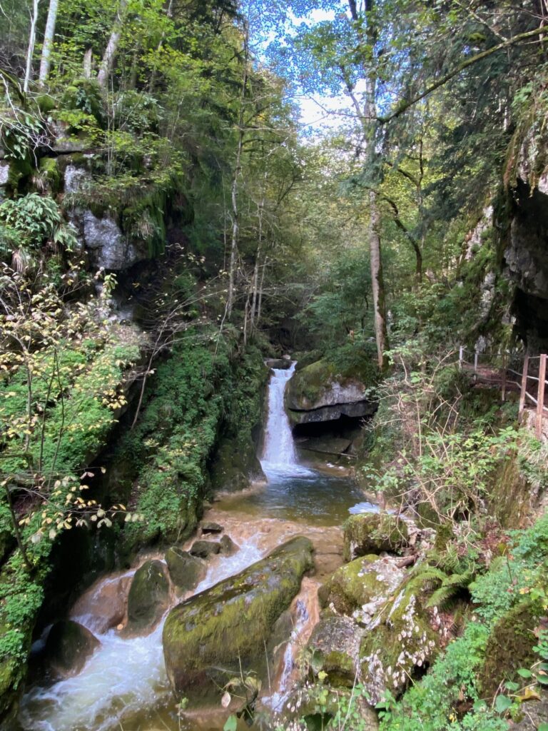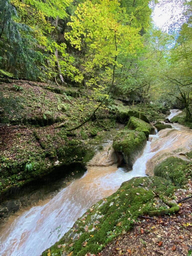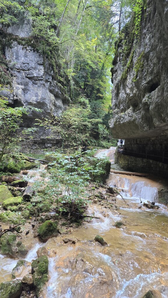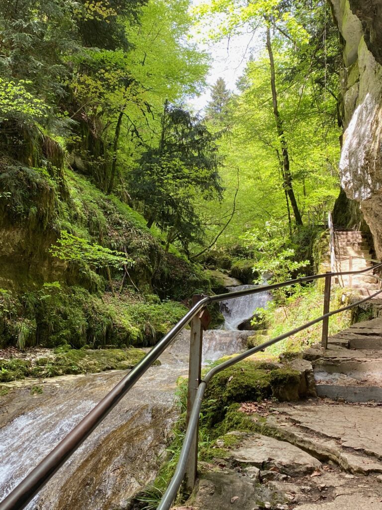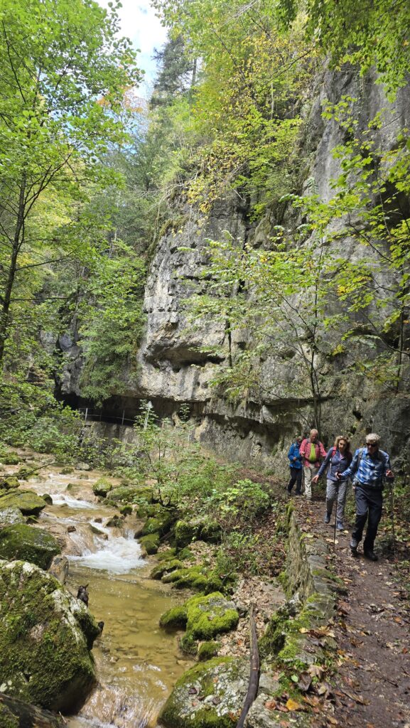 Kurz nach dem Aufbruch hören wir bereits im Wald das leise Rauschen des Twannbaches. Der Mühleweg, ein nicht ganz leicht begehbarer Steinweg, der in seiner Beschaffenheit wie eine römische Strasse wirkt, fordert unsere volle Aufmerksamkeit, um nicht zu rutschen. Der Twannbach wird wilder, fliesst über türkisfarbene Felsbrocken, über weitere Kaskaden und immer tiefer in die 1892 erschlossene Schlucht hinab. Der Wanderweg, zwar noch mit Steinen durchdrungen, erweist sich hier leichter begehbar und mit Geländern abgesichert. Majestätisch aufragende Felswände, Jahrtausende lang vom Wasser geformt. Kleinere Baumstämme, die Felsen umarmen. Grössere, wie Skulpturen im Wasser liegend oder dieses überbrückend.