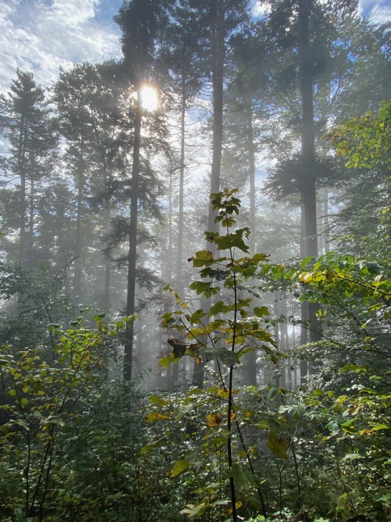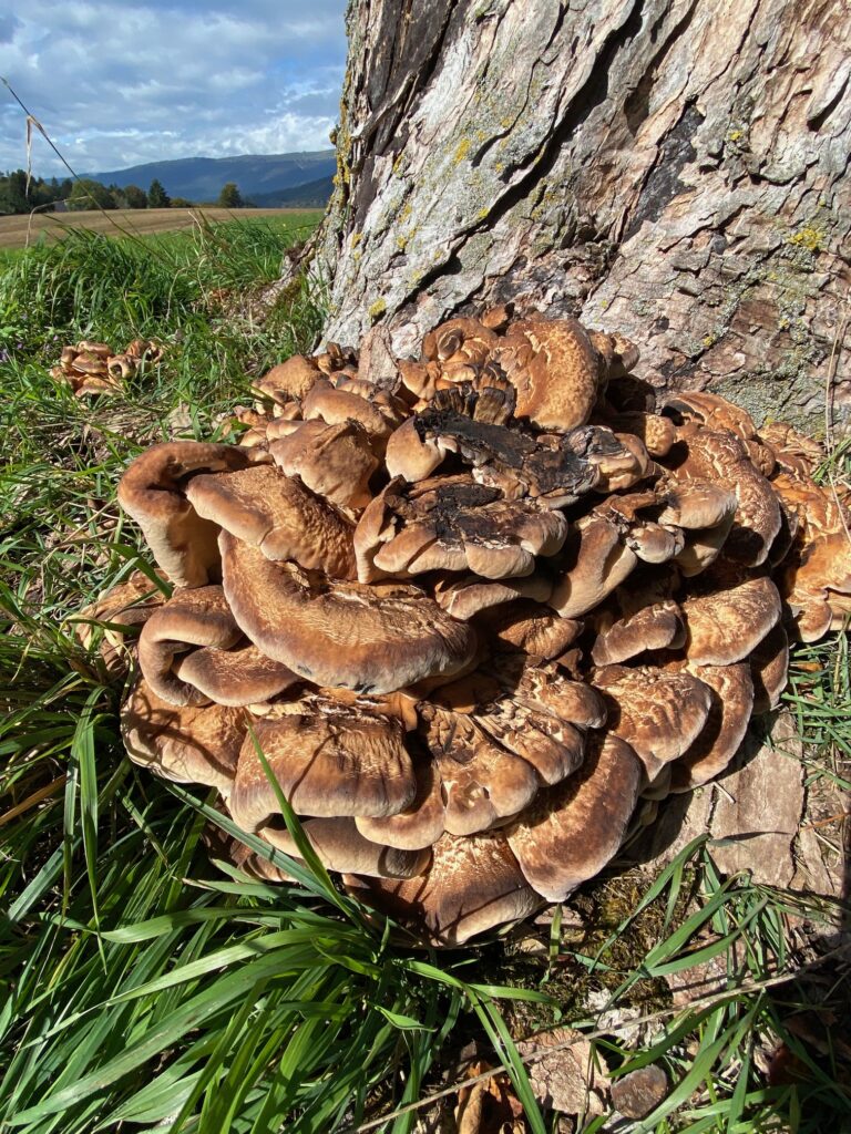«Es darf nicht wahr sein, gleich nach dem Kaffee den steilen Weg hoch die 100 Meter Aufstieg bewältigen!» Glück gehabt, der Wanderweg verläuft dem Magglingerberg entlang. Heute ein nebelverschleierter Zauberwald, den die durchscheinende Sonne in mystisches Licht taucht. Nebelgeister, die erstaunlicherweise Panthern ähneln, tauchen auf und verschwinden. Ein Geist sucht Pilze, nicht zum Essen, sondern zum Fotografieren. Fliegenpilze sind die Favoriten. Es gibt aber keine Fliegenpilze. Später dann nach dem Waldweg über das Plateau mit den Wiesen eine wunderbare Pilz- und Flechtformation am Fusse eines Nussbaumes, die jedes Kunstobjekt übertrifft. Rechterhand am Horizont der Chasseral mit dem Sendeturm. Kühe als Fotosujet, was dann Kühe mit Panthern ergibt.