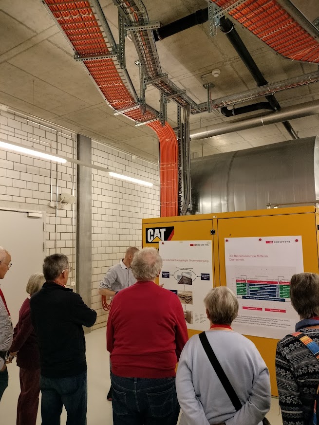 Beeindruckend war zu sehen, wie ausgeklügelt die Stromversorgung in der Betriebszentrale jederzeit sichergestellt ist. Sollte der Strom aus dem öffentlichen Netz ausfallen, so stellen zuerst Batterien für 60 Minuten und anschliessend 4 Generatoren die Stromversorgung für max. 72 Stunden sicher.