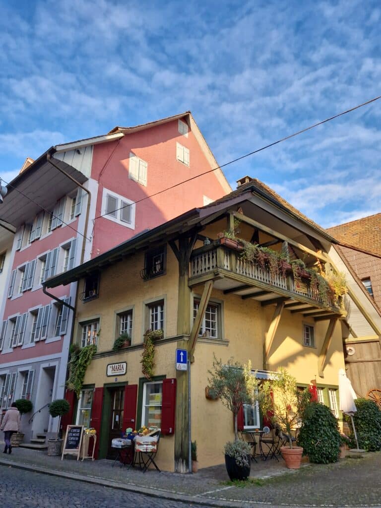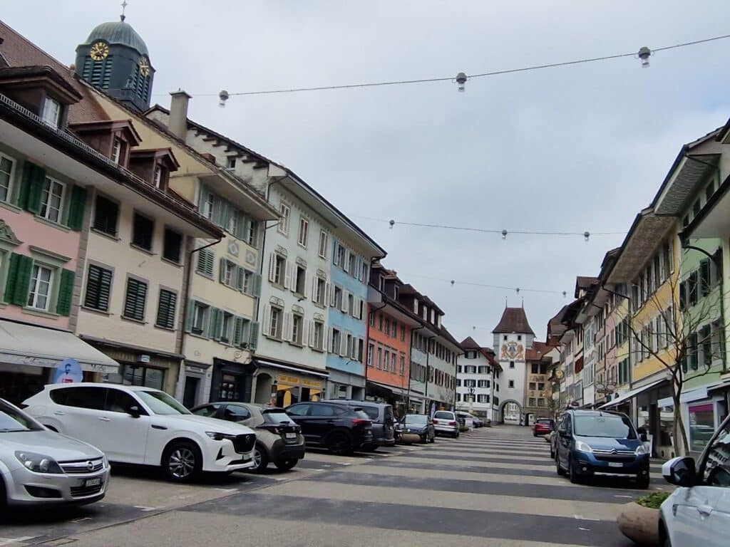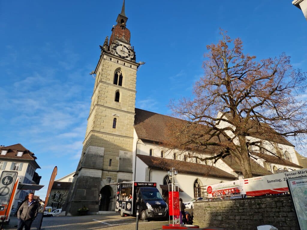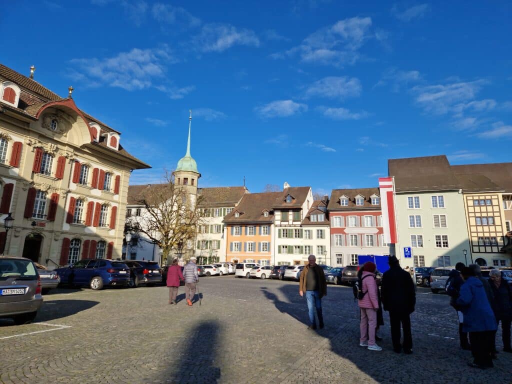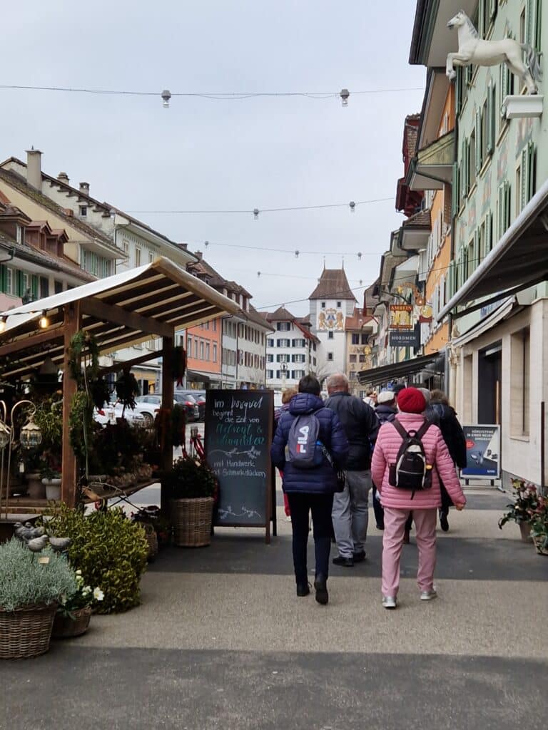 Zofingen empfing uns mit einem Warenmarkt, farbig-bunt. Wir hätten gerne ein wenig Zeit gehabt zum «Luege und Lädele» aber der gedeckte Mittagstisch wartete auf uns. Verschiedene Teigwaren taten unserem Magen wohl und so begaben wir uns gestärkt zur Erkundung des Städtlis. Pia hatte sich gut vorbereitet und zeigte uns Unter -und Oberstadt, erklärte die einzelnen wichtigen Gebäude, Plätze, die Stadtkirche, in der wir dem Organisten bei der Probe zuhören konnten. Zofingen war bei seiner Gründung eine hölzerne Stadt, erlebte viele Totalbrände und wurde immer wieder aufgebaut auf dem alten Raster Heute zeigt sie ein modernes Bild. Aber man erkennt trotzdem noch ihre mittelalterliche Vergangenheit. Auffallend sind die vielen kunsthandwerklichen Kleinode, die viele Häuser schmücken. Relikte, aus alten Zeiten: schmiedeeiserne Schilder für Wirtshäuser, Handwerker, heute auch moderne Geschäfte. Augenweiden!