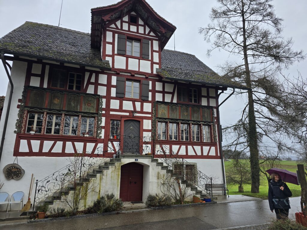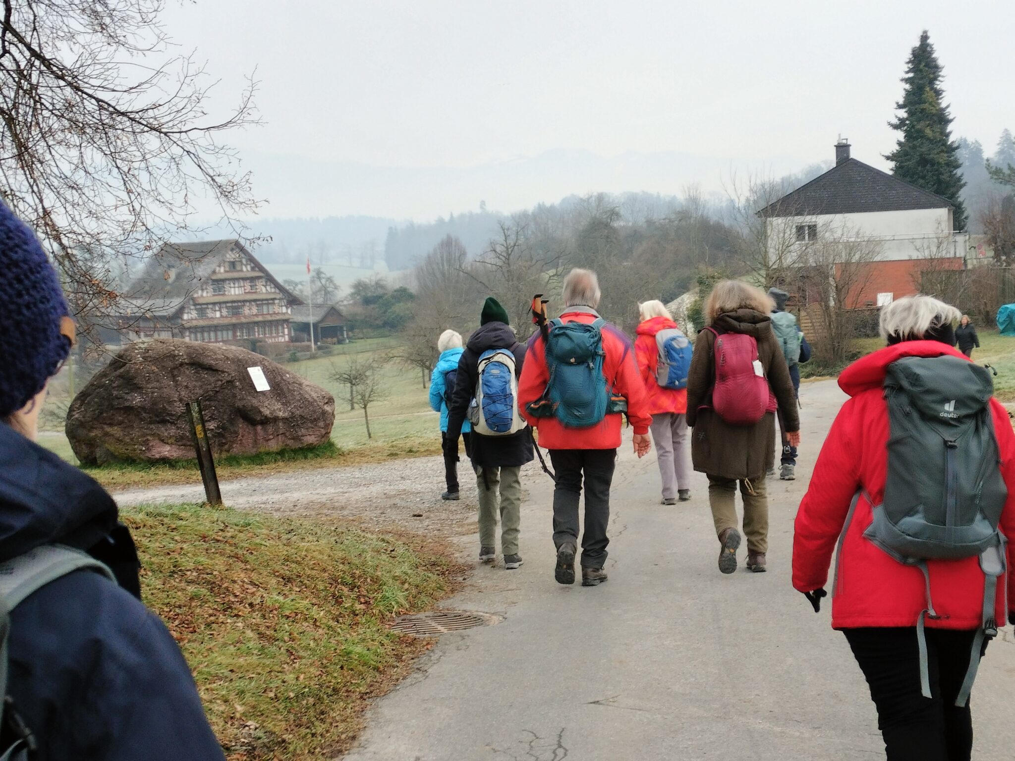 19 Wanderlustige steigen in Zürich in ein Bähnli ein, das uns der rechtsufrigen Seite des Zürichsees entlangführt mit vielen Rebbergen und Riegelhäusern. Nach der Busfahrt hinauf auf den Hügelzug bis Mühlehölzli wandern wir durch die Landschaft unter bedecktem Himmel und ahnen die Berge jenseits des Sees.