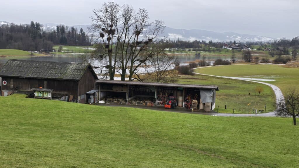 Im Schaugarten könnten wir einen kräftigen Zierbaum auswählen. Ein Rotbrüstchenpaar ist auch grad dran, sich das schönste Plätzchen auszusuchen. Gemähte Schilfflächen breiten sich aus. In einem riesigen Baum beim Bauernhaus sehen wir riesige Mistelbüsche – die sich dann als Storchennester erweisen. Und später sehen wir auch noch 5 ihrer Bewohner am Futterpicken.