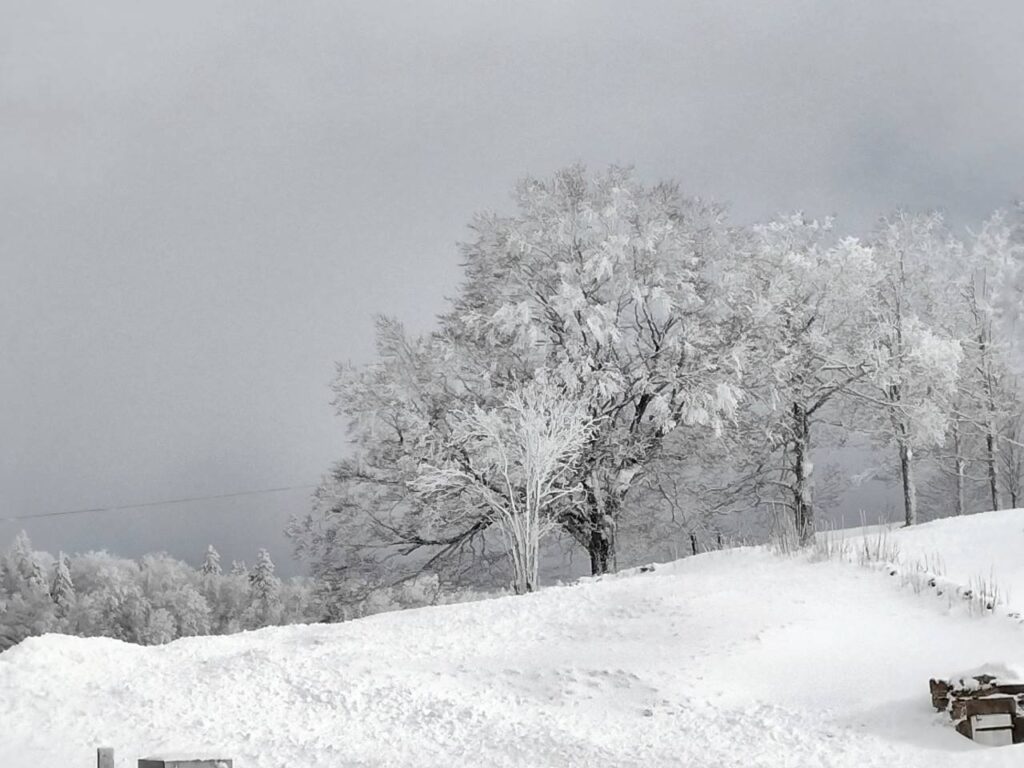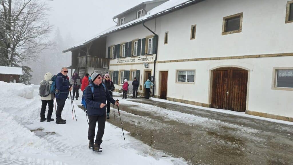 Ausgerüstet mit „Iseli“ – so nennt Heinz die Spikes, die für Eis und den Neuschnee unerlässlich waren – machten sich die Wanderer auf den Weg zum Hinterweissenstein. Der Schnee lag etwa 10 cm hoch und verwandelte die Landschaft in ein winterliches Märchen. Trotz der nebligen Bedingungen war die Stimmung hervorragend, und die Gruppe genoss die Ruhe und die mystische Atmosphäre der verschneiten Wälder.