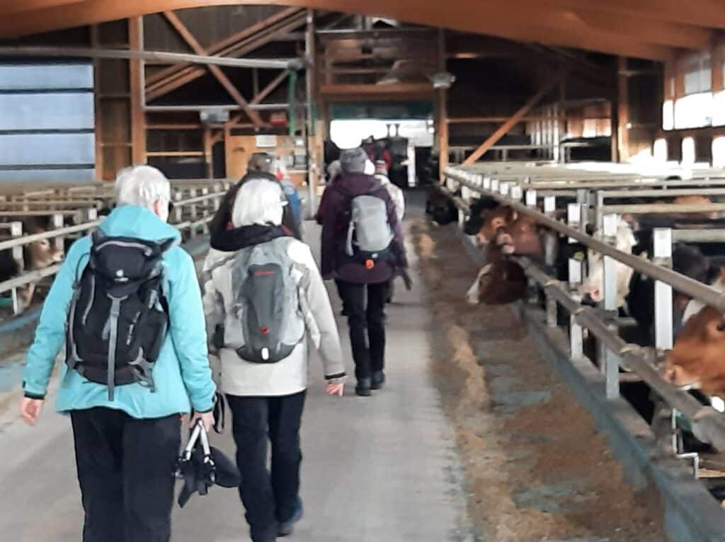 Von Nesselboden ging es bequem mit der Gondelbahn zurück ins Tal. Von dort ging es zu Fuss zur Busendstation Oberdorf. Fast am Ende des Abstiegs mussten wir wegen einer riesigen «Glungge» auf dem Wanderweg durch einen Jungviehstall. Der anwesende Bauer war gar nicht erfreut. Kurz nach dem Stallabenteuer, Züsi kraulte noch einen Kalbskopf, ging es mit dem Bus und dann mit dem Zug zurück nach Bern.