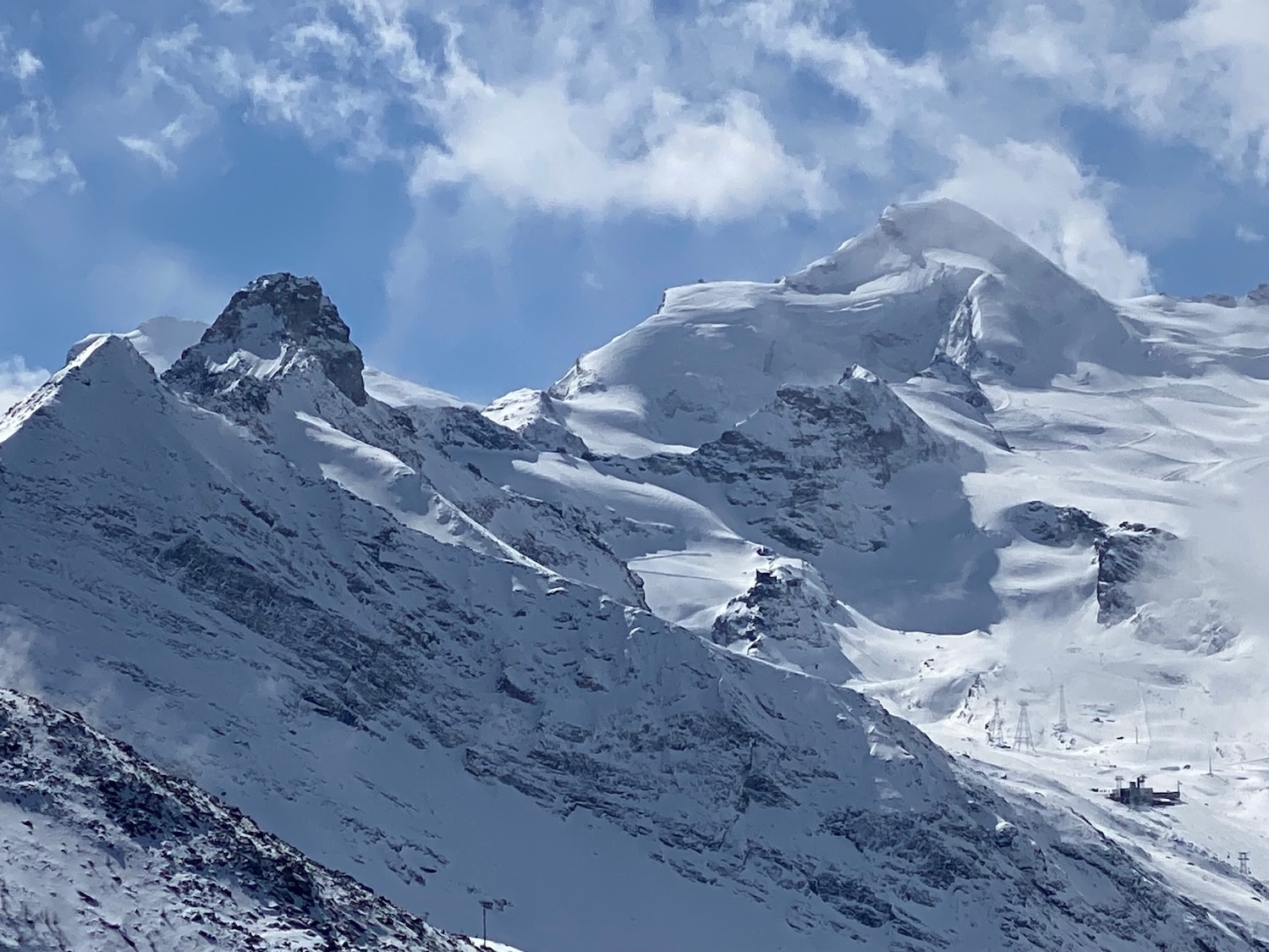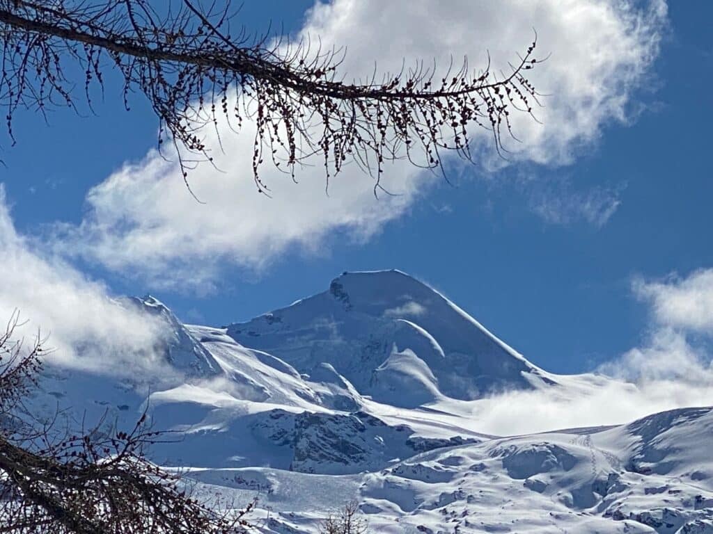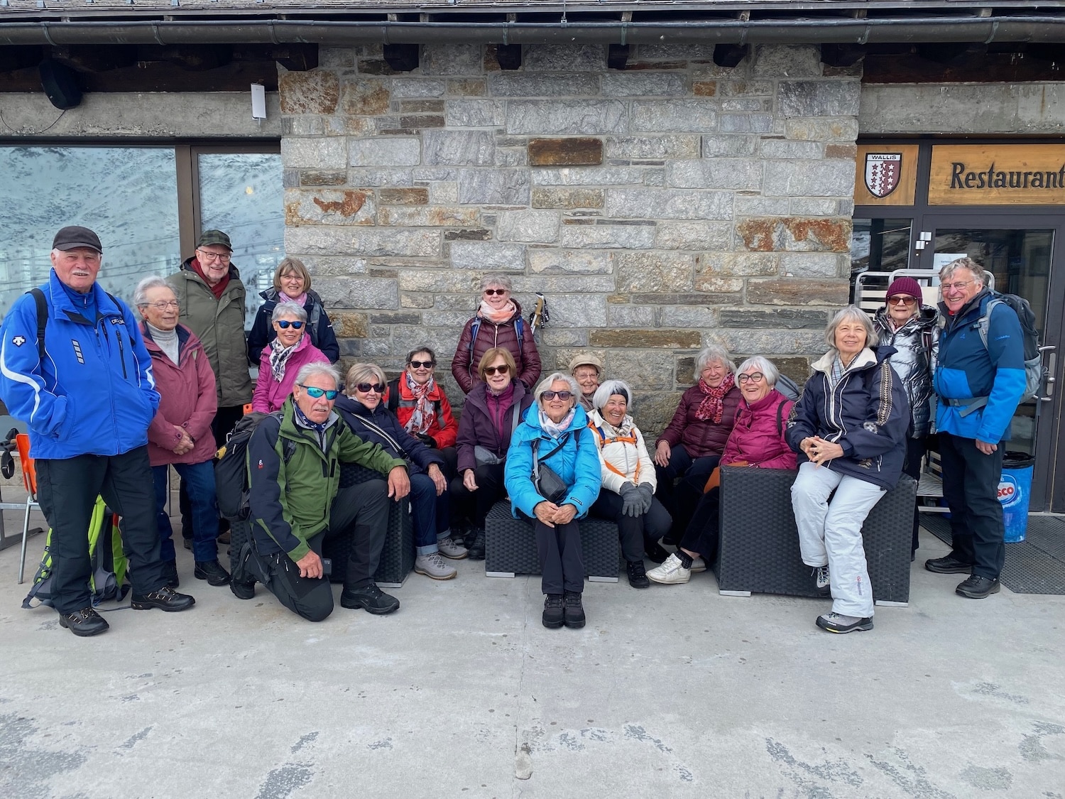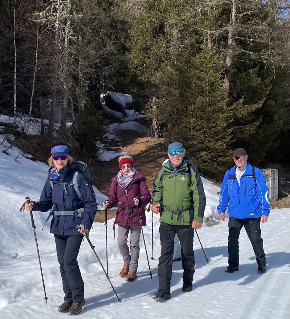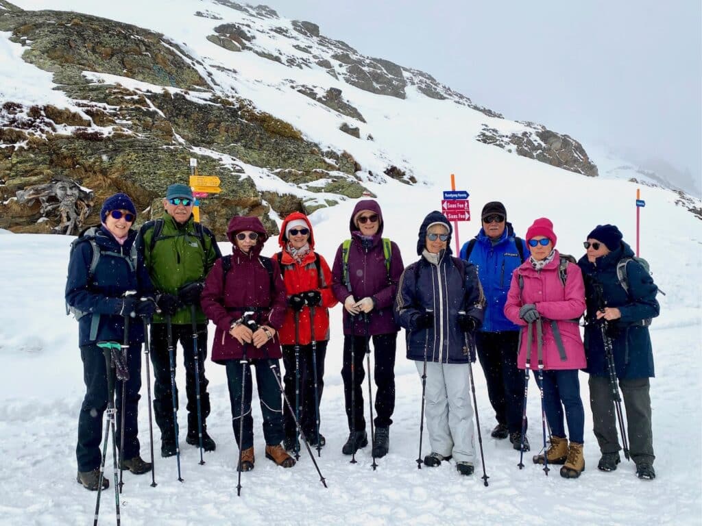 Für die 2*-Wanderer heisst es am Montag Sonnenweg Hannig! Die neue Gondelbahn bringt uns von Saas Fee auf den Hannig, auf 2330 müM. Sonne? Es ist grau-verhangen, windig und kalt. Also rasche Rettung ins wärmende Restaurant! Der Tag ist noch jung, alles kann besser werden… Fotografisch starten wir mit einem Gruppenbild, und die bunte Winterkleidung setzt farbige Akzente ins Grau. Der breite Wanderweg schlängelt sich durch offenes Gelände und lichte Lärchenwälder talwärts. Und oh Wunder, die Sonne bricht durch den Schleier und zwischen den Wolken zeigen sich Allalin und Alphubel in voller Pracht! Ein verdienter Abschlusstrunk auf einer sonnigen Terrasse in Saas Fee krönt diesen gelungenen Wandertag.