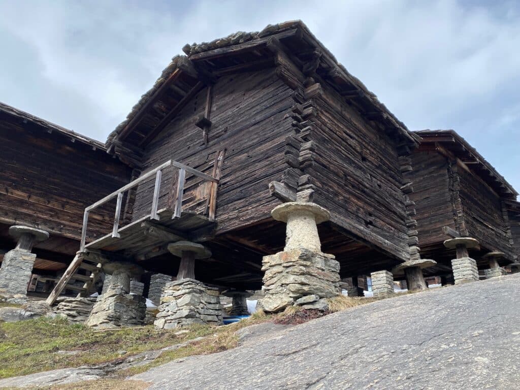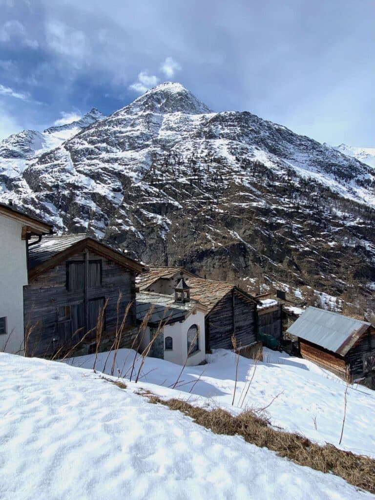 Bei eisigem Wind führt uns Annabelle, die Tochter der Hoteliersfamilie am Abend durch das Dorf. Wir lernen einiges über die Lebensbedingungen in diesem einst so abgeschiedenen Bergtal. Mit Annabelle besuchen wir die drei alten Dorfteile mit ihren von der Sonne schwarz gefärbten Holzhäusern. In einem Stall hören wir Schafe blöken. Die Schäferei hat im Saastal mit ihren Saaser Mutten einen grossen Stellenwert. Grosse, wenn auch tragische Bekanntheit, erlangten die Saaser Mutten als 2014 auf der Alp 103 Tiere (damals rund ein Viertel des Bestandes) gestohlen wurden. Mit grossem Aufwand wird versucht, den Bestand dieser seltenen Rasse wieder zu erhöhen.