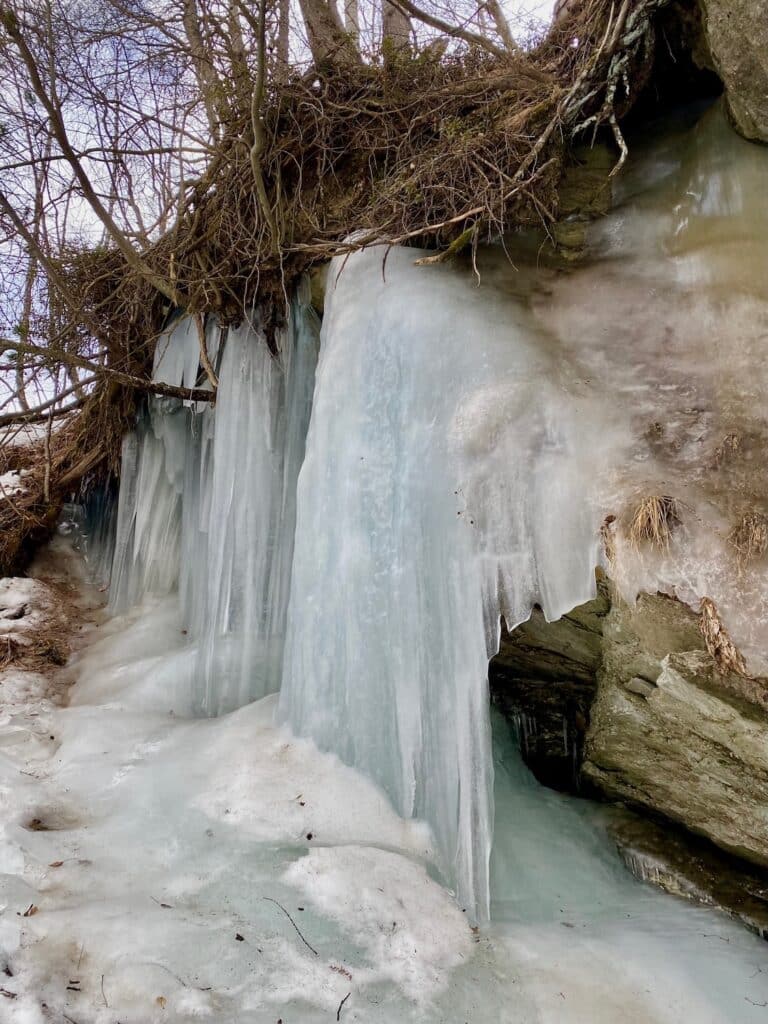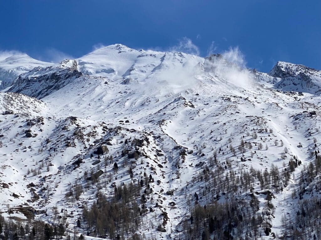 Schon am ersten Tag geht’s los, noch bevor wir das Hotel erreichen. Geplant sind Wanderungen für 3*- und 1*-Wanderer sowie für Bummler. Also stärken wir uns während der Tunnelfahrt Kandersteg-Visp mit den mitgebrachten Sandwiches. Per Extra-Postkurs fahren wir durch das enge Saastal nach Saas-Balen, resp. Saas Grund zum jeweiligen Wanderstart. Der abwechslungsreiche Talwanderweg entlang der Saaser Vispa folgt grösstenteils der Langlaufloipe. Schillernde Eiszapfen hängen wie Orgelpfeifen an den Felsen, unter den Sohlen knirscht der Schnee, der Weg ist ab und zu rötlich gefärbt durch die Nadeln der vielen Lärchen. Gegen den Wind kämpfend, erblicken wir talaufwärts die ersten imposanten Gipfel. Die rauschende Saaser Vispa scheint unsere Schritte zu beschleunigen. Aus der Ferne grüssen das majestätische Almagellerhorn und die Dächer von Saas-Almagell.