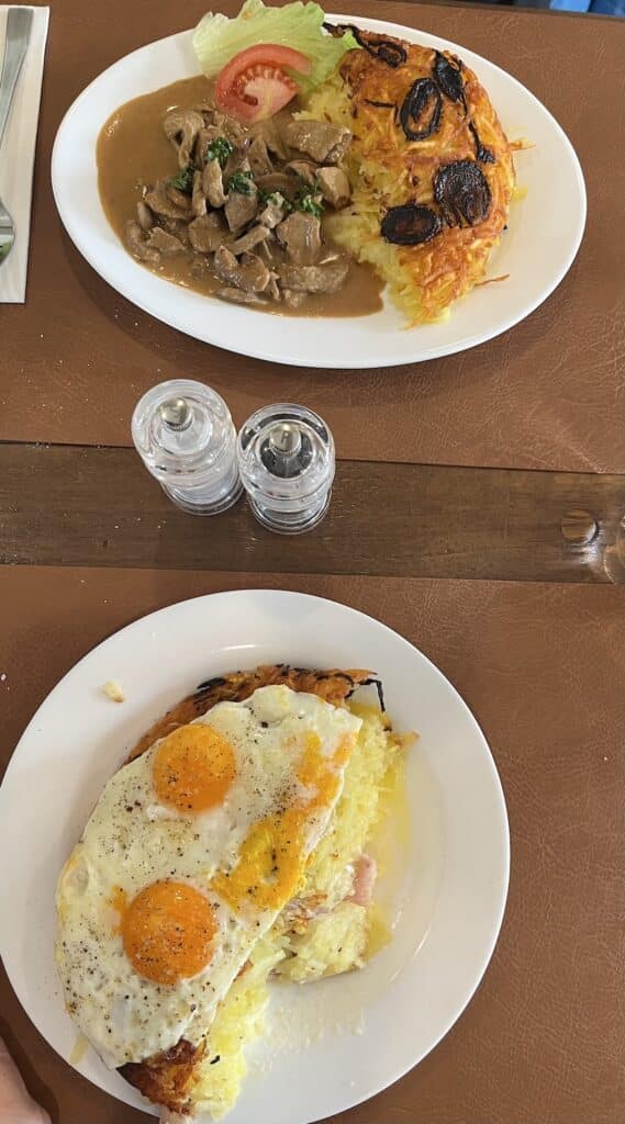 An «Windmühlen» vorbei – übrigens mit sehr vielen sehr lebendigen Vögel ringsum – und durch Fledermaus- und Wichtel-Wege gelangten wir zur Auberge de Peu-Péquignot («pöpegginio» ausgesprochen). Im schönen Restaurant genossen wir eine herrliche Rösti mit Begleitung – und dies jenseits des Röstigrabens !