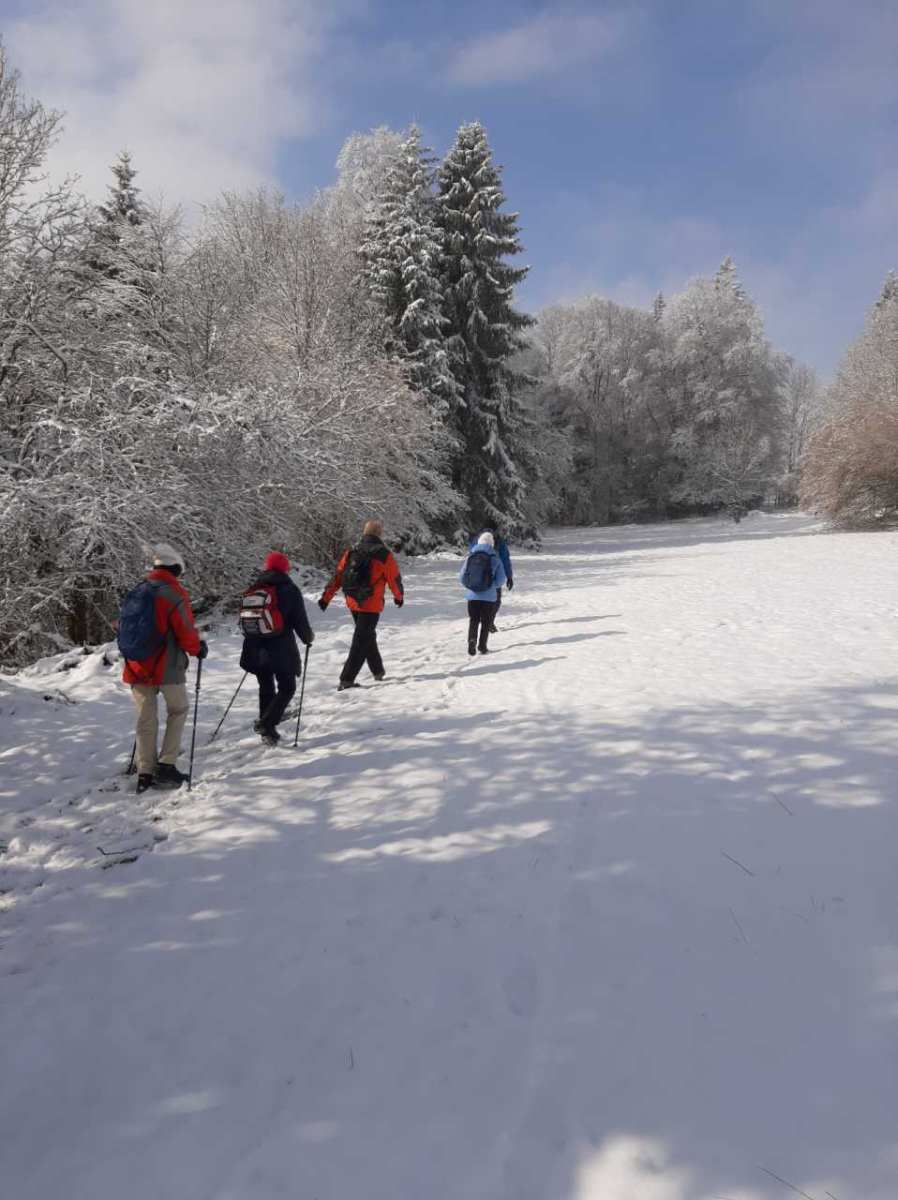Die Wanderung startete mit einer leichten Steigung, bei recht kühlen Temperaturen, aber noch ohne Bise. Der Schnee versuchte, unter unseren Schuhen zu knirschen. Von den Bäumen rieselte ganz leicht der Schnee. Die Landschaft wurde immer jurassischer, der Himmel immer Blauer, das Wetter immer sonniger – rundum prächtig !