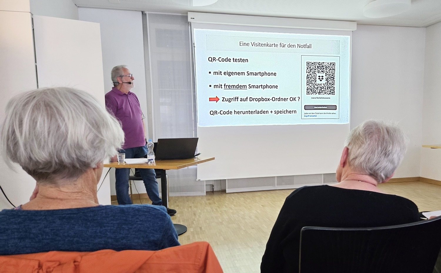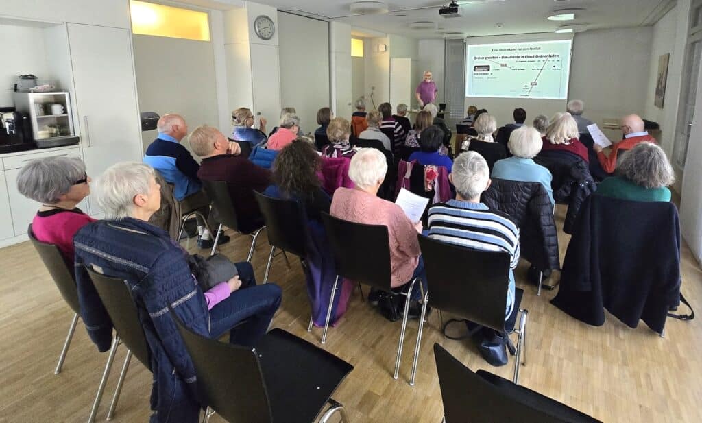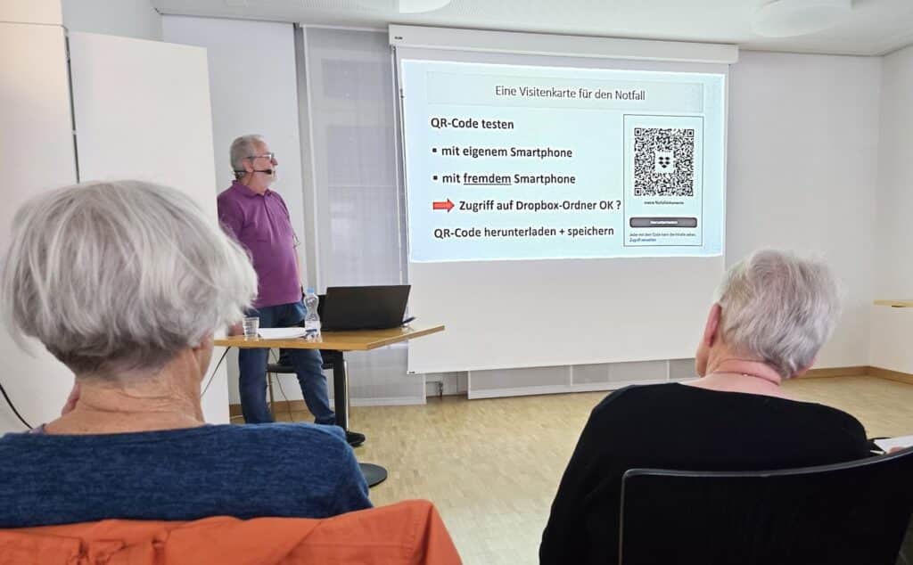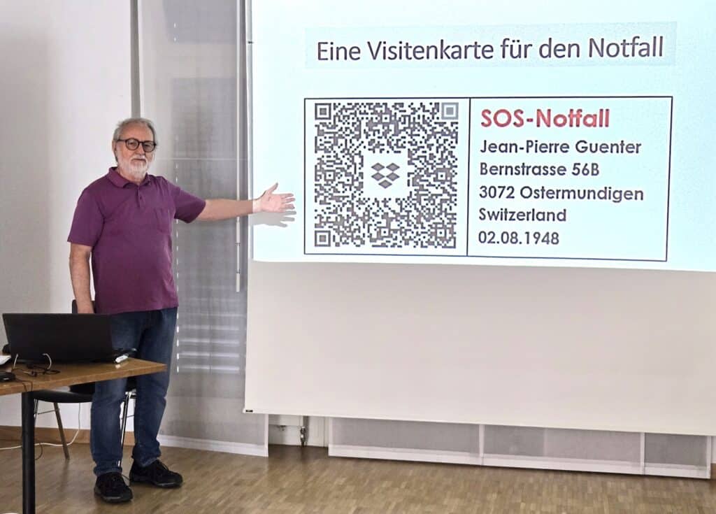 Eine vergangene eigens erlebte Notfallsituation hat Jean-Pierre inspiriert, diese Notfall-Visitenkarte zu kreieren, damit im Notfall die zuständigen Personen mittels QR-Codes auf unsere wichtigen Dokumente Zugriff haben. Zu Beginn wurden wir darauf aufmerksam gemacht, dass die diesbezügliche Anleitung auch auf der Website der Grauen Panther Bern zur Verfügung steht. Schritt für Schritt erklärte uns Jean-Pierre die einzelnen Schritte und gab dabei auch hilfreiche Tipps und weiterführende Informationen, was so nebenbei nicht nur zu angeregten Fragen aus dem Publikum führte, sondern den Vortrag auch interessant erweiterte. Er wies u.a. auf das hilfreiche Vorsorgedossier des Beobachters hin („Ich bestimme“) oder machte darauf aufmerksam, dass keine Word-Dokumente in die „Wolke“ geladen werden sollten und erklärte dabei auch gleich, wie ein Word-Dokument in eine pdf-Datei umwandelt werden kann. Gut verständlich führte er uns durch die Anleitung und beantwortete geduldig die aufgetauchten vielseitigen Fragen. Er wies auch immer wieder darauf hin, dass wir uns bei Problemen (wenn wir irgendwo anstehen) an die „Hotline“ von der Digi-Pantherin Christiane wenden können: „in allen Lagen Christiane fragen“.