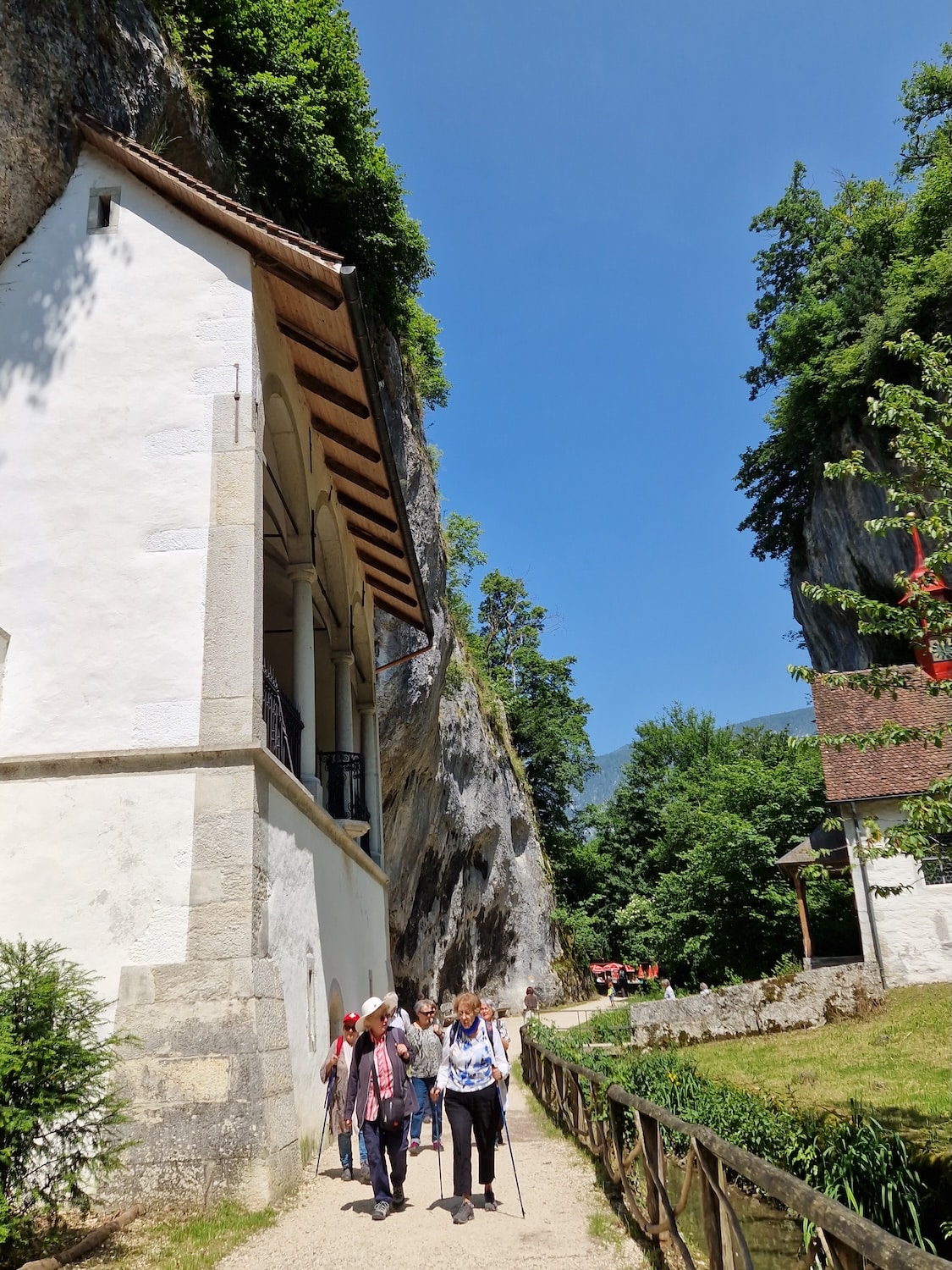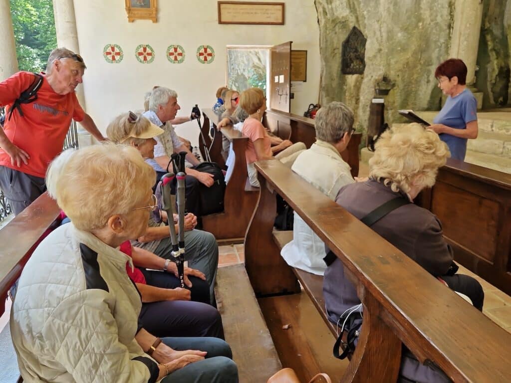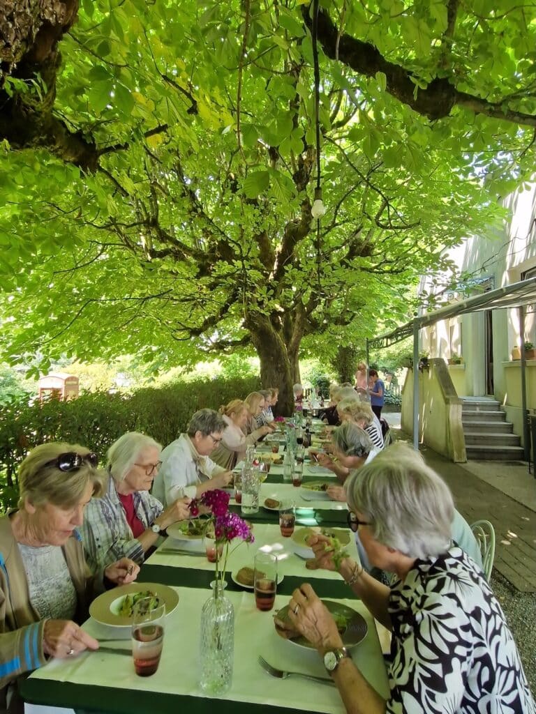 Nach diesem spirituellen und landschaftlichen Genuss stärkten wir uns im «Pintli», wo wir unter grossen, Schatten spendenden Kastanienbäumen ein feines Mittagessen geniessen durften. Das Personal war äusserst aufmerksam und flexibel – unsere vielen individuellen Wünsche wurden freundlich und geduldig erfüllt. Ein herzliches Dankeschön dafür.