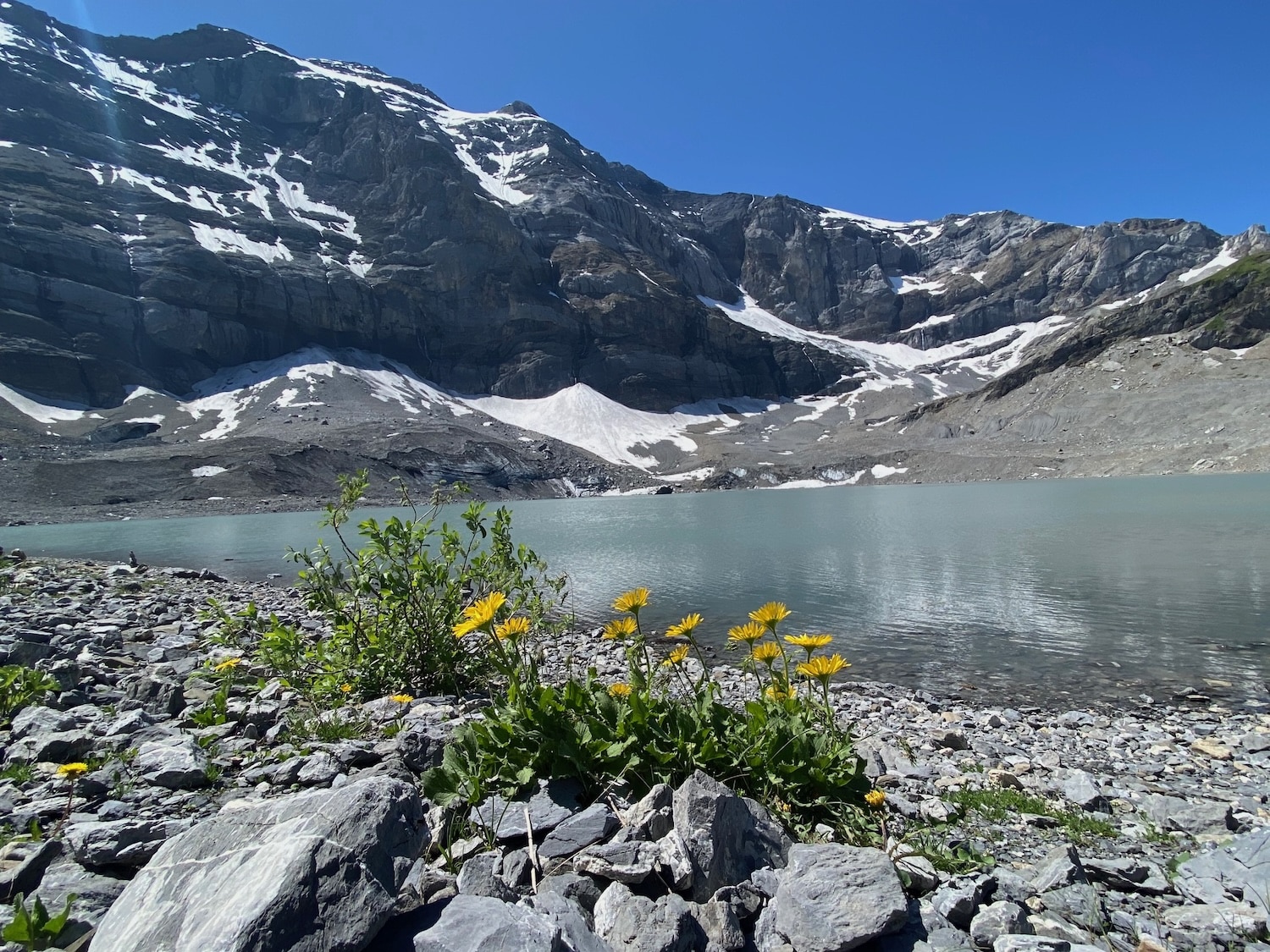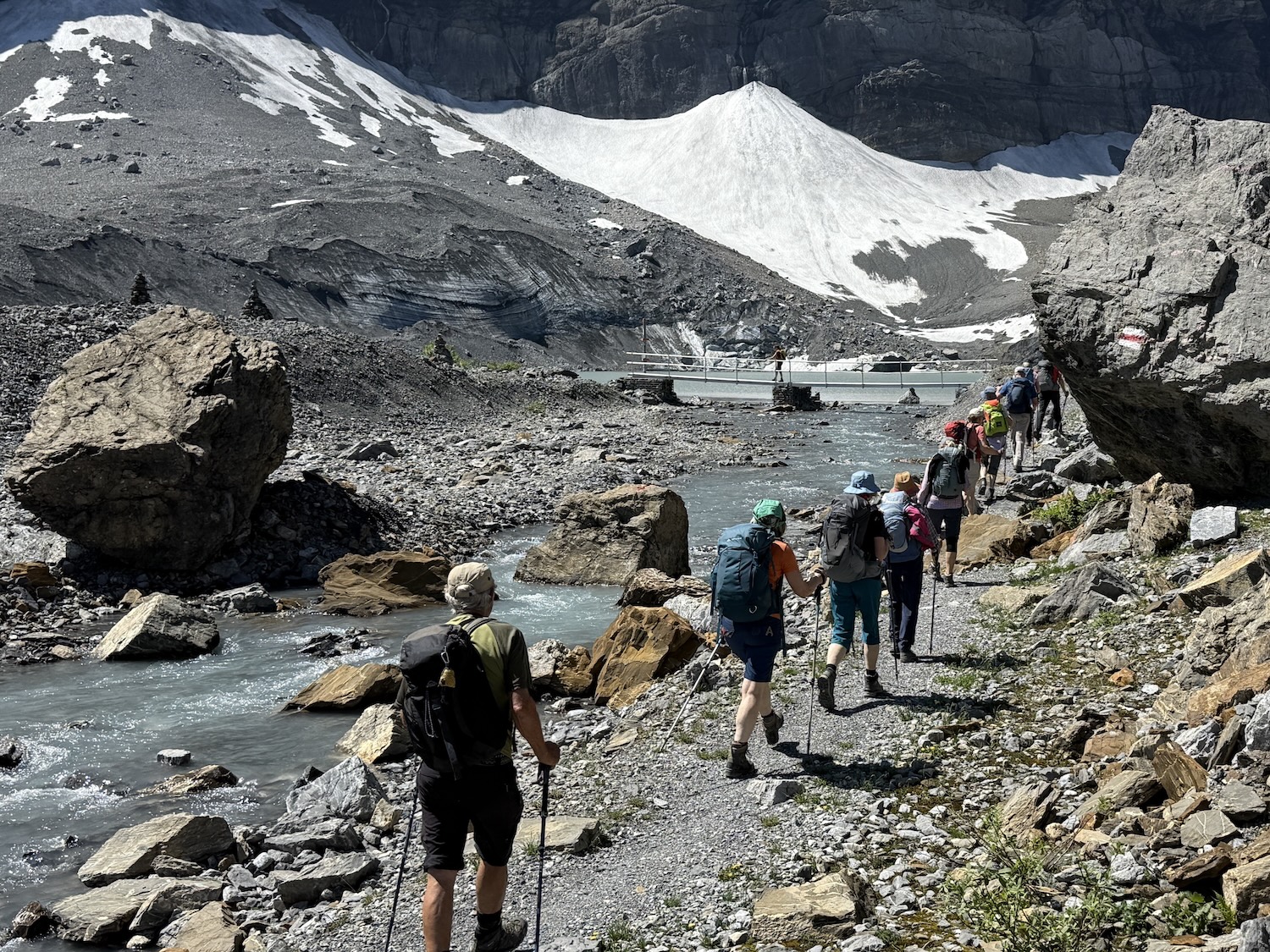 Zum Start der zweiten Tageswanderung brachte uns nach dem gemütlichen Frühstück , eine vom Chauffeur interessant kommentierte Postautofahrt vom Urnerboden auf den Klausenpass. An Schneefeldern vorbei wandernd, erreichten wir die Moränenlandschaft und den eindrücklichen Gletschersee vor der Nordwand des Clariden-Massives. Ein paar Mutige trotzten der Hitze mit einem «coolen» Bad im See, und alle Hungrigen und Durstigen konnten sich nach dem nächsten Wanderabschnitt im Gemsfaierenhüttli verpflegen.
