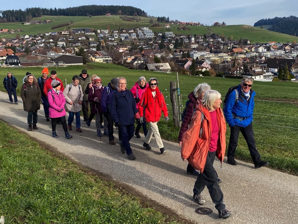 Wenn die Wanderleiterin Sylvia Hüftschmerzen hat, geht die Leitung nahtlos an den Stellvertreter Ruedi über, und als Schluss-Treiber steht schon Arnold mit der orangeleuchtenden Kappe parat. UND wenn die Beiz für den Schlusstrunk in Schlosswil geschlossen hat, dreht man die Wanderung leicht um, so dass wir dann zuletzt in Tägertschi landen. Ganz einfach!