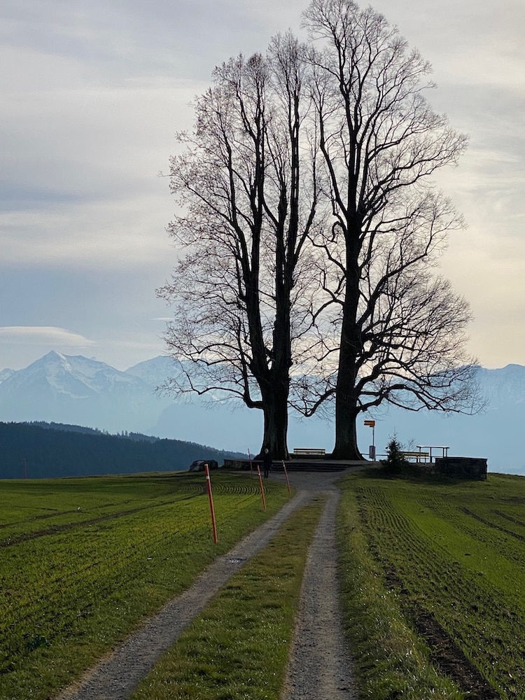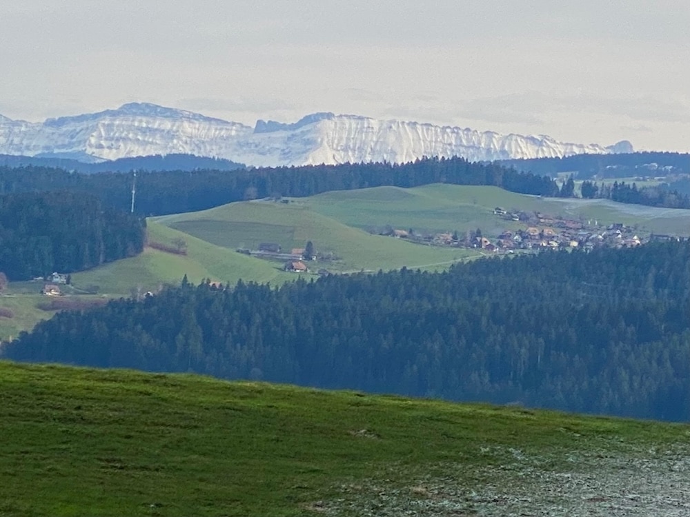 Die schneeweisse Schrattenfluh mit den schwarzen Schraffuren und der dunkle Hohgant sind sehr deutlich, markant. Die Gantrischkette wirkt wie „g’loubsägelet“, wie ein blaugraues Reliefband in der Ferne. Wir wandern und plaudern (ehm, also beim stotzigen Stutz keuche ich schweigend). Und als sich am Waldrand oben die Welt wieder auftut mit der schon im „Sprung“ versprochenen weiten Sicht, da freuen wir uns über klaren Himmel und Sonnenschein.