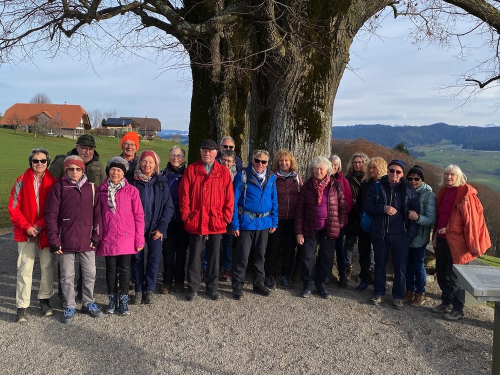 Beim Ballenbühl, der Insel im Grünen unter 2 Bäumen, mit Panoramatafeln und Sitzbänken, erinnert sich Ruedi, dass er vor etwa 15 Jahren seine allererste Pantherwanderung auch in dieser Gegend geleitet hat. Und wie schon so oft deutet er dann etwas neblig vage gegen Westen zum Mont Blanc. Er kann uns diesen – wo auch immer wir sind – mit ziemlicher Sicherheit und ohne Augenzwinkern zeigen! Bald naht unser Schlusstrunk und ich freue mich, diese schöne Wanderung geschafft zu haben, gehöre ich doch zu den älteren Pantherseniorinnen.