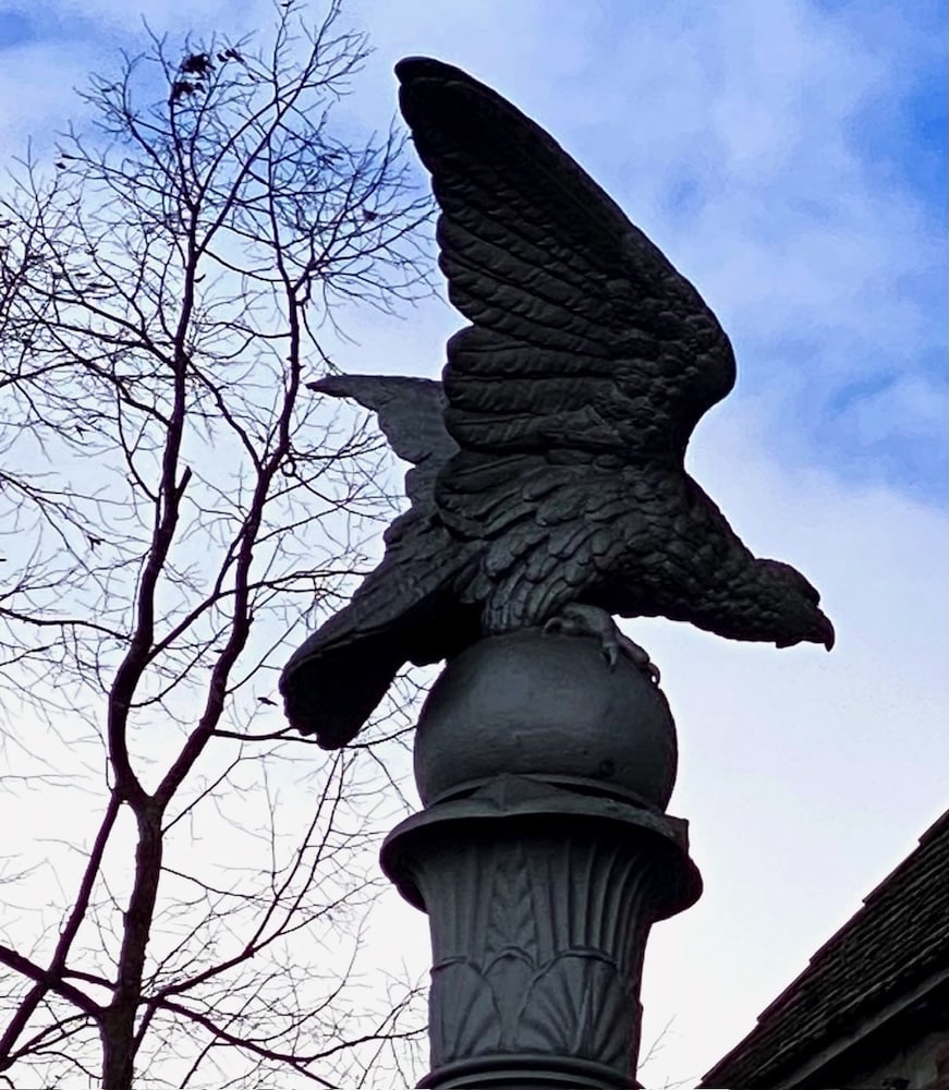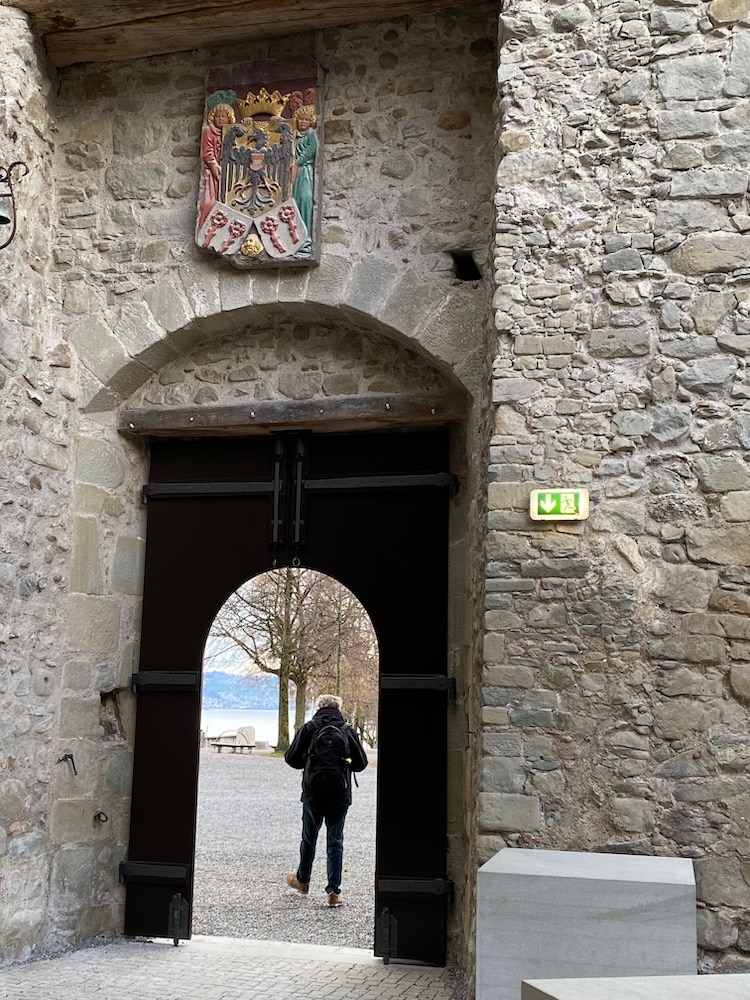 Ein paar Unentwegte steigen mit Ruedi zum imposanten Schloss, von wo aus sich uns ein bezaubernder Ausblick über den Zürichsee, die Altstadt, den Seedamm und den über 800m langen Spazier-Holzsteg nach Hurden bietet. Das Schloss beherbergte lange ein Polenmuseum. Heute sind die Räumlichkeiten sehr begehrt für Hochzeiten und Firmenfeiern. Auf der Burgterrasse erhaschen wir auch einen Blick auf die vom Bildhauer Louis Wethli geschaffene Freiheitssäule mit Adler; diese symbolisiert die Verbundenheit der Völker, die um ihre Freiheit ringen. Den Weg zum Restaurant säumen imposante Herrenhäuser mit Malereien und Erkern.