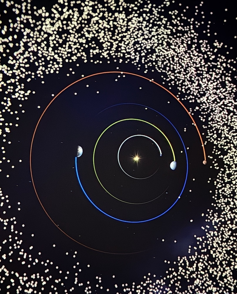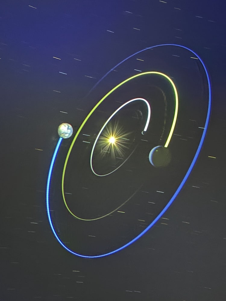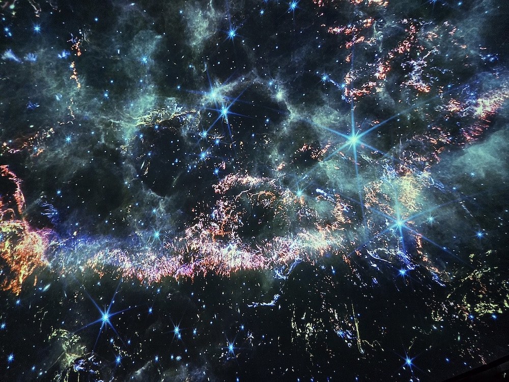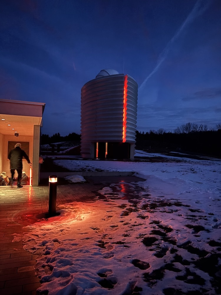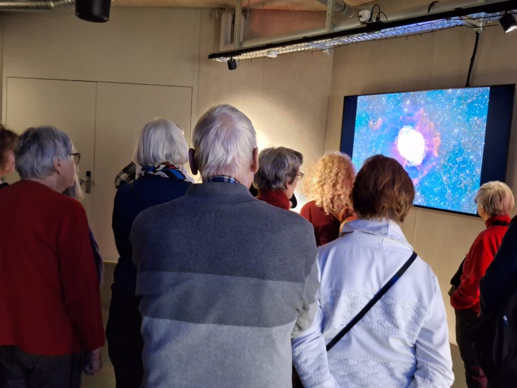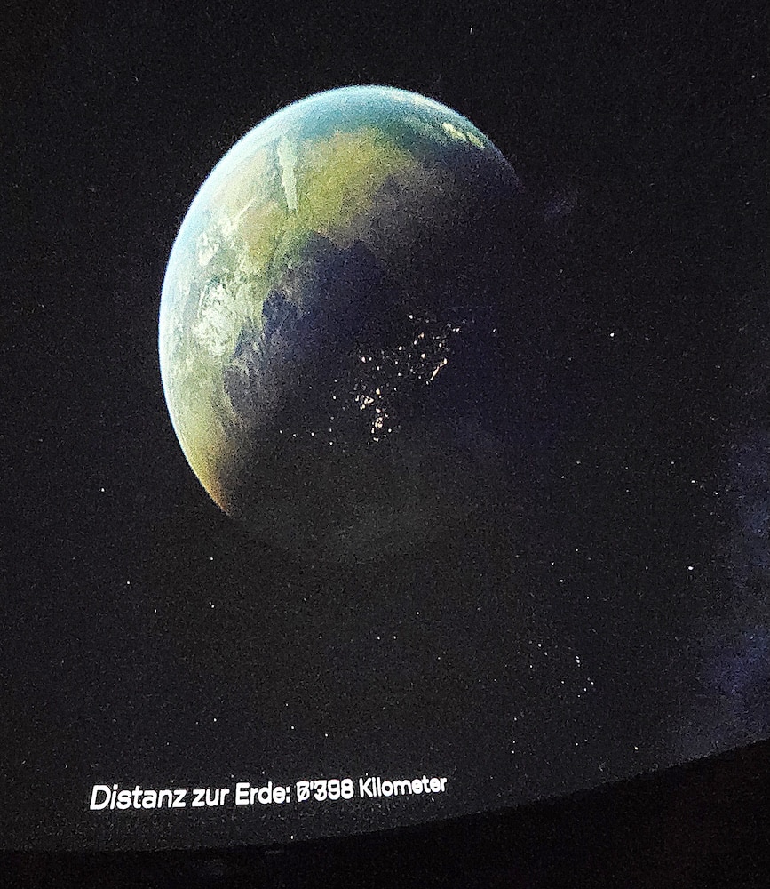 Zum Glück erfährt der Verfasser der vorliegenden Zeilen erst während der zweiten Etappe des Besuchs im «Space Eye», dass ein Bericht aus seiner Feder erwünscht sei. Doch davon später. Dem Organisator des Ausflugs zum Observatorium, Beat Jaggi, ist als ehemaligem Mathematik- und Physiklehrer sehr wohl bewusst, welche astrophysikalischen Leckerbissen uns im Mario Botta-Bau in Niedermuhlern erwarten. Das Vorstellungsvermögen der meisten Besuchenden hingegen wird während der faszinierenden Filmvorführung im Planetarium auf die Probe gestellt: Auf der «virtuellen Reise bis zum Ende des bekannten Universums» ist mehrmals die Rede von Milliarden. Das Universum, über 10 Milliarden Jahre alt, beherbergt Hunderte von Milliarden Galaxien; ein Objekt präsentiert sich unseren Augen aus der Entfernung von 1 Milliarde Lichtjahren so, wie es vor 1000 Millionen Jahren ausgesehen hat …