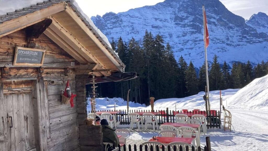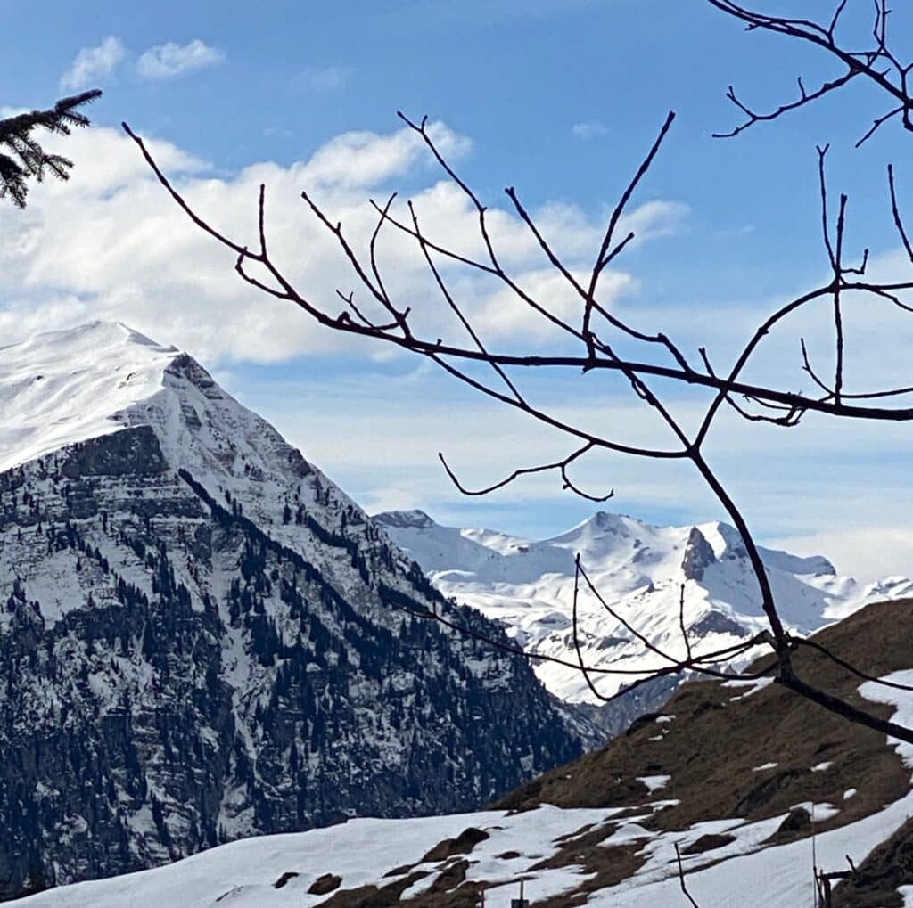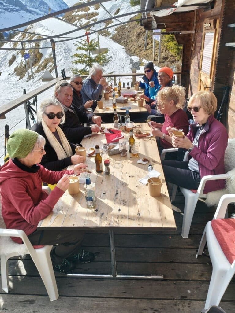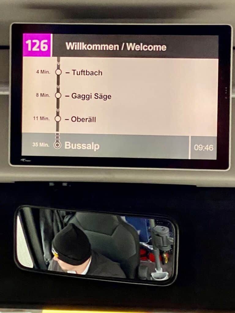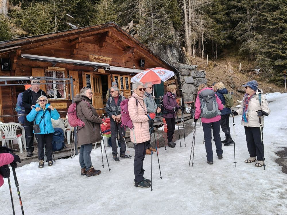 Zuerst ging’s, nach der Bahnfahrt, ab Grindelwald mit dem Bus auf die Bussalp, von 1035 auf 1797 m ü.M., mit Schneeketten auf einem schmalen, steilen Strässchen mit viiiiielen Haarnadelkurven. Oben gab’s im Restaurant Kaffee und Gipfeli – die meisten verklemmten sich, einen Nussgipfel oder ein Stück Nusstorte zu verputzen.