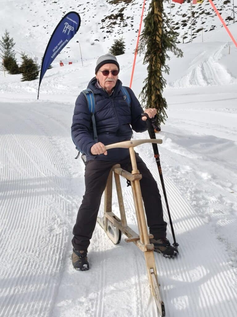 Dann bot uns Heinz eine Demonstration des Velogemmels, eines Grindelwaldner-Weltunikats. Übrigens, am 8.2. fand die 30. Velogemmel-WM statt, Heinz wurde als Ältester 77. von 100 (siehe angehängtes PDF, Seite 2).
